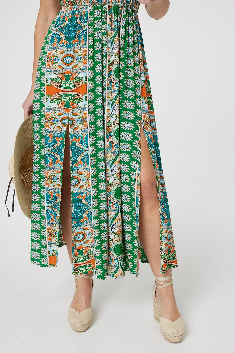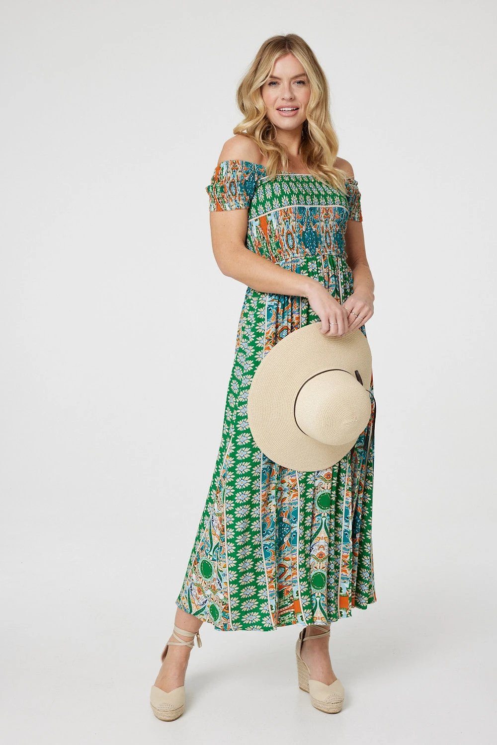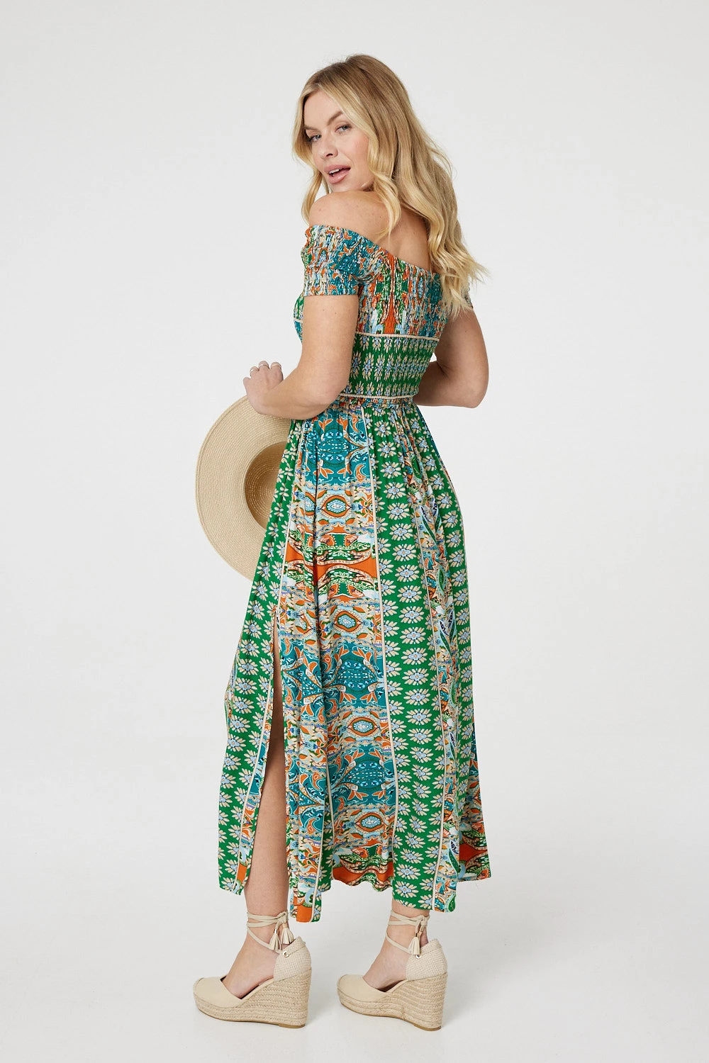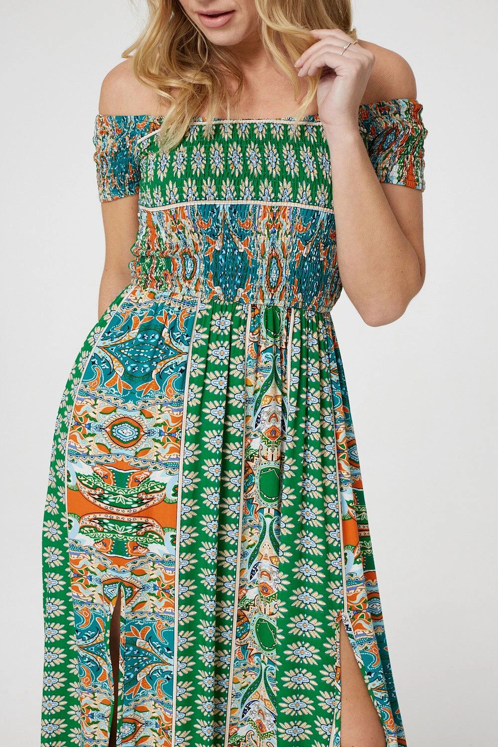 Say hello to your new favourite dress – this summery maxi. It has a glamorous Bardot neck with a smocked bodice, maxi length hem and side splits. The off-the-shoulder cut is flattering on all figures and perfect for working on your summer tan!