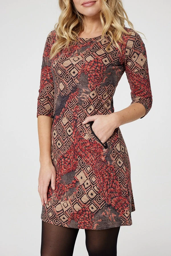 Every capsule wardrobe needs a go-to printed tunic dress like this one. It has a round neck with a button detail, 3/4 sleeves, pockets, a fitted silhouette and a short length hem. Made in a comfortable brushed jersey fabric. Pair with opaque tights and boots for a cold weather style that’s a great addition to any cold weather wardrobe.