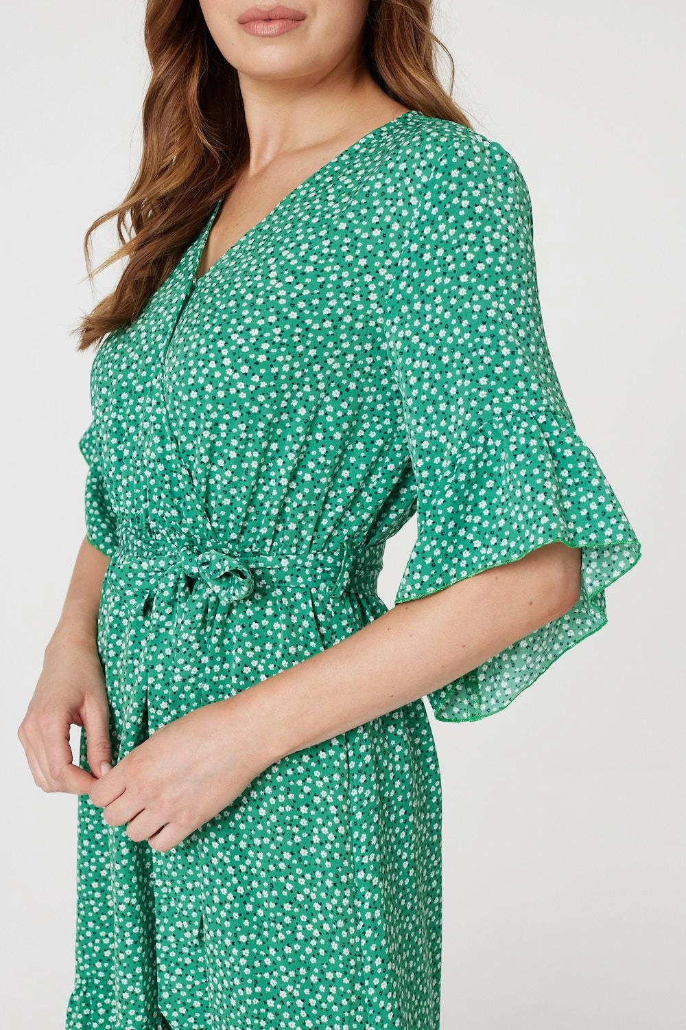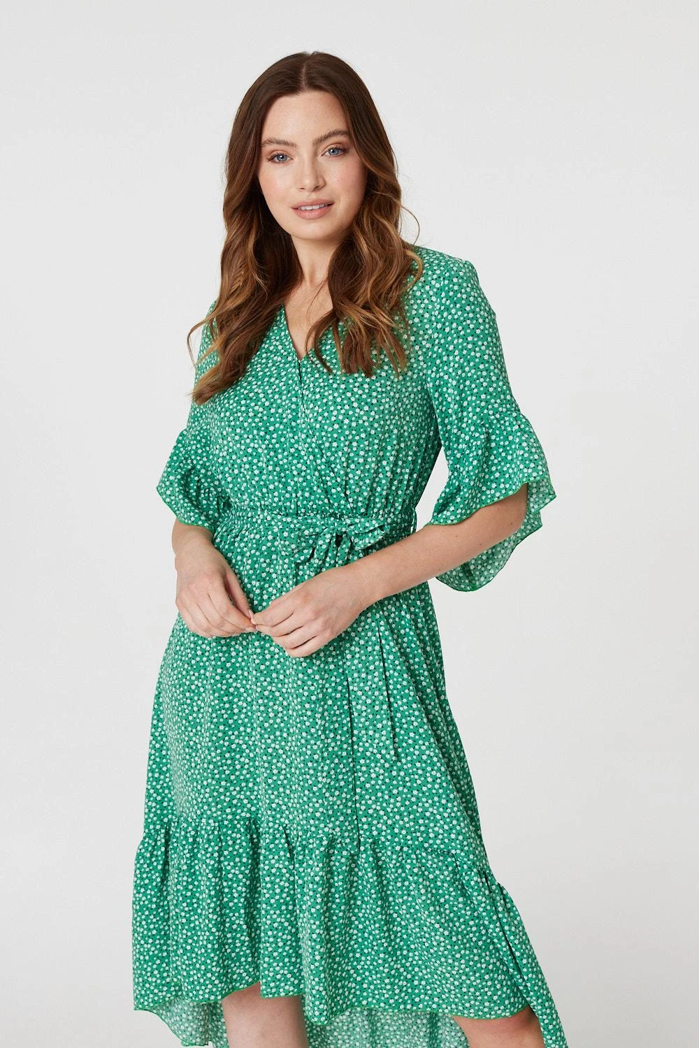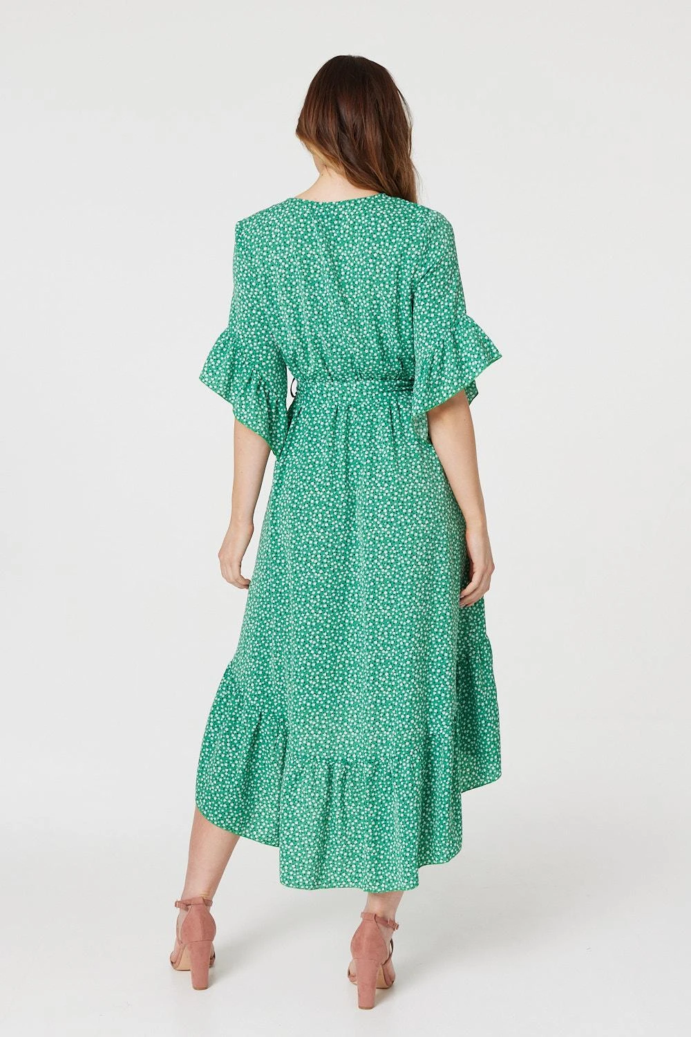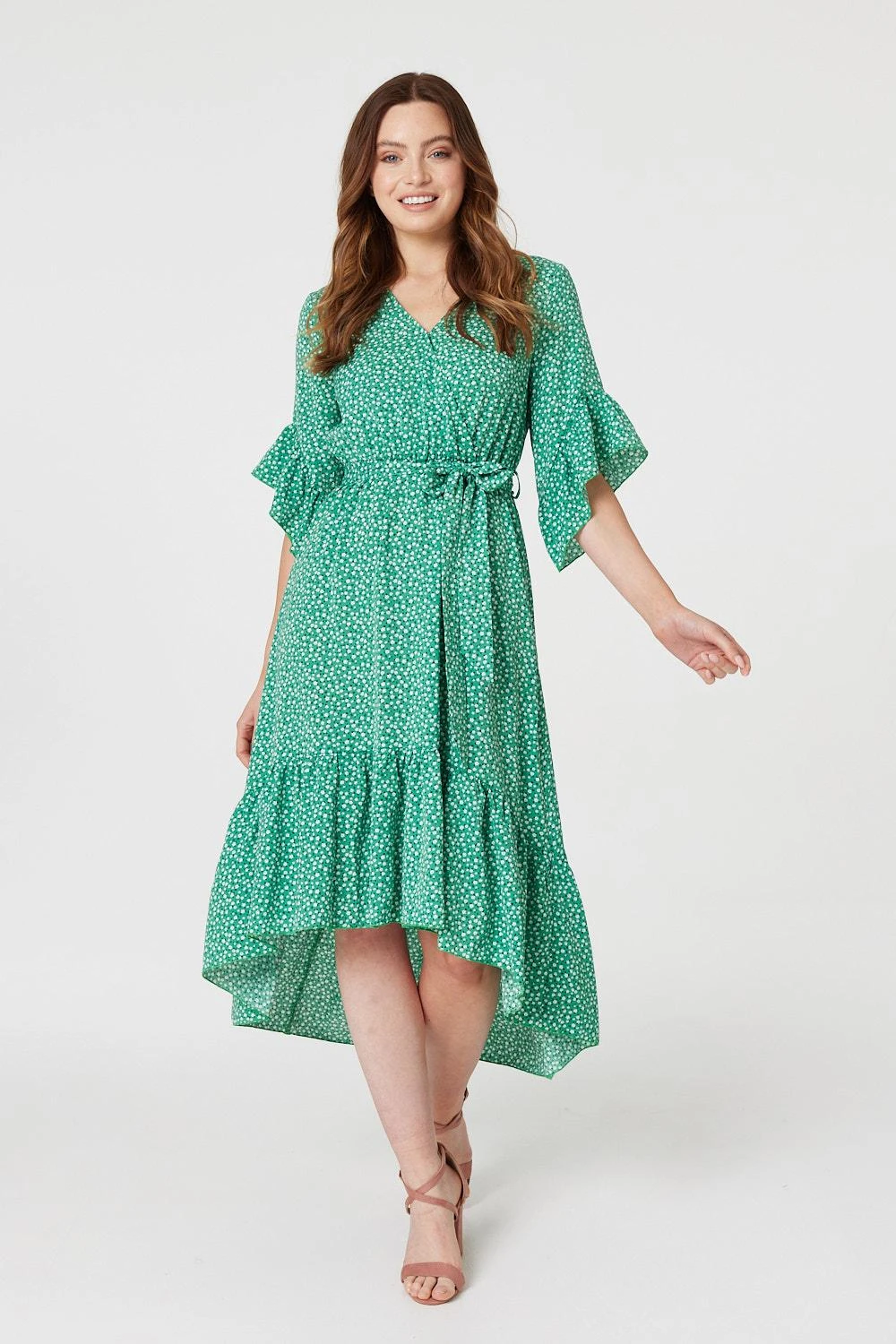 Every occasion collection needs a figure flattering wrap front maxi dress like this printed high low dress. With a v-neck, wrap front, 3.4 sleeves with frilled cuffs, an elasticated waist, a tie detail removable belt and a full skater skirt with a tiered hem and a maxi length. Style with metallic accessories for an elegant event look or dress down on holiday with flat sandals and a straw bag.