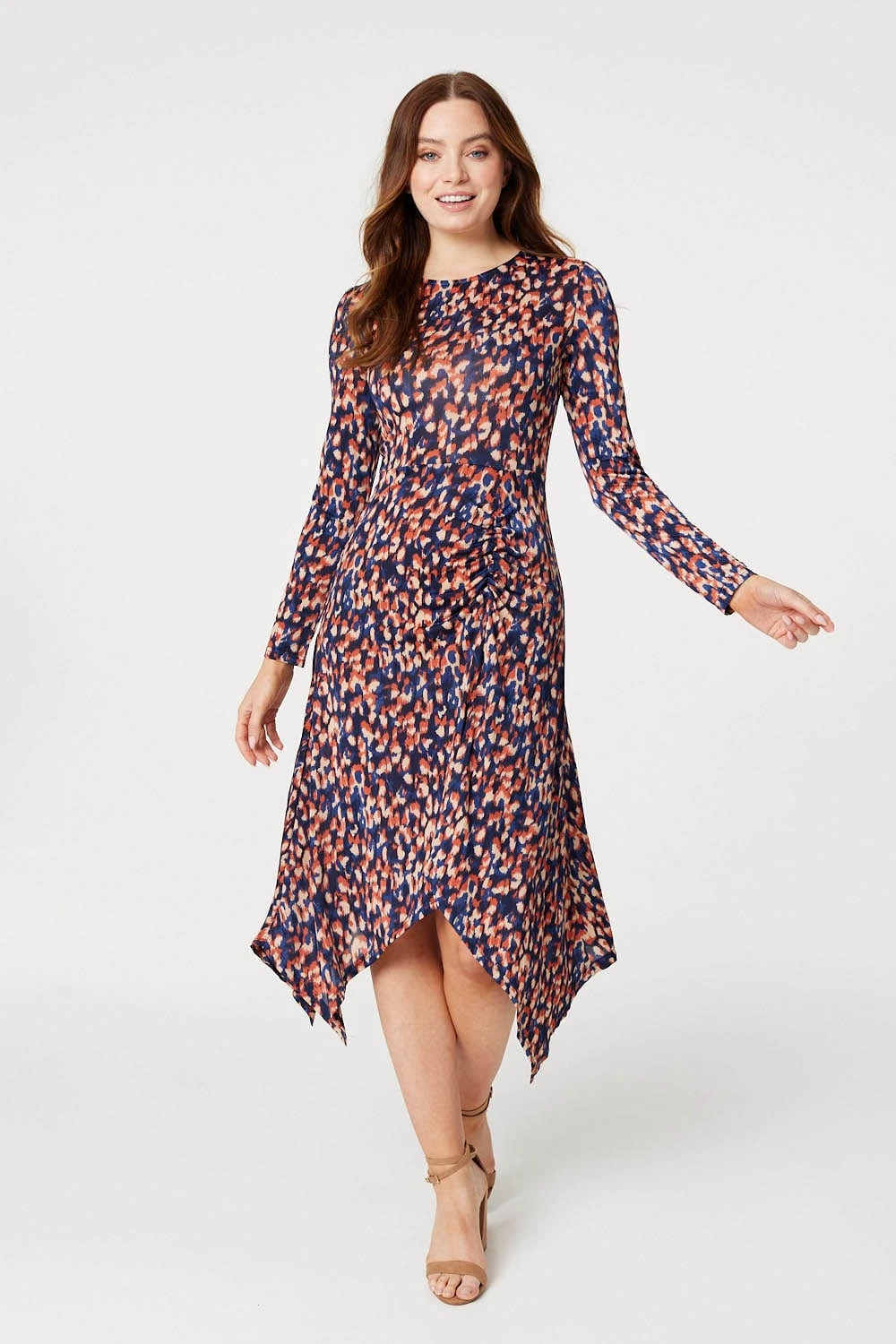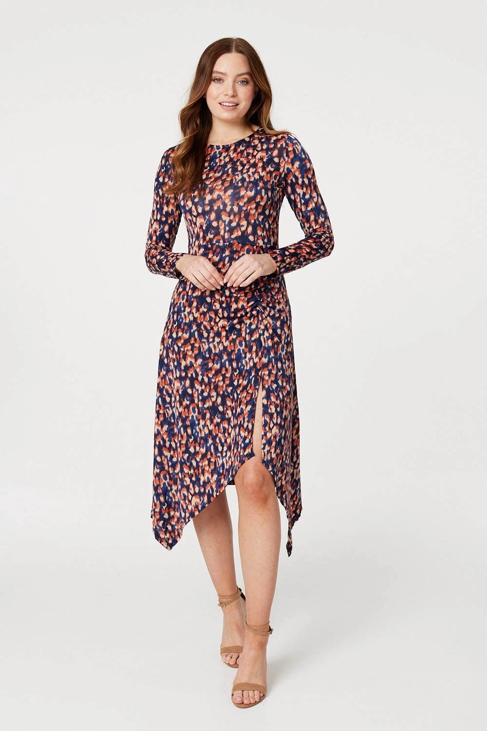 Make a stylish statement in this stunning abstract printed midi dress. With a round neck, long sleeves, a flattering ruched front detail, a slim fit, a side slit and a pretty hanky hem sitting below the knee. In a slinky jersey stretch fabric that doesn’t need ironing! Style with metallic heels for a smart dinner event or pair with heeled boots and a teddy coat for a smart-casual office look.