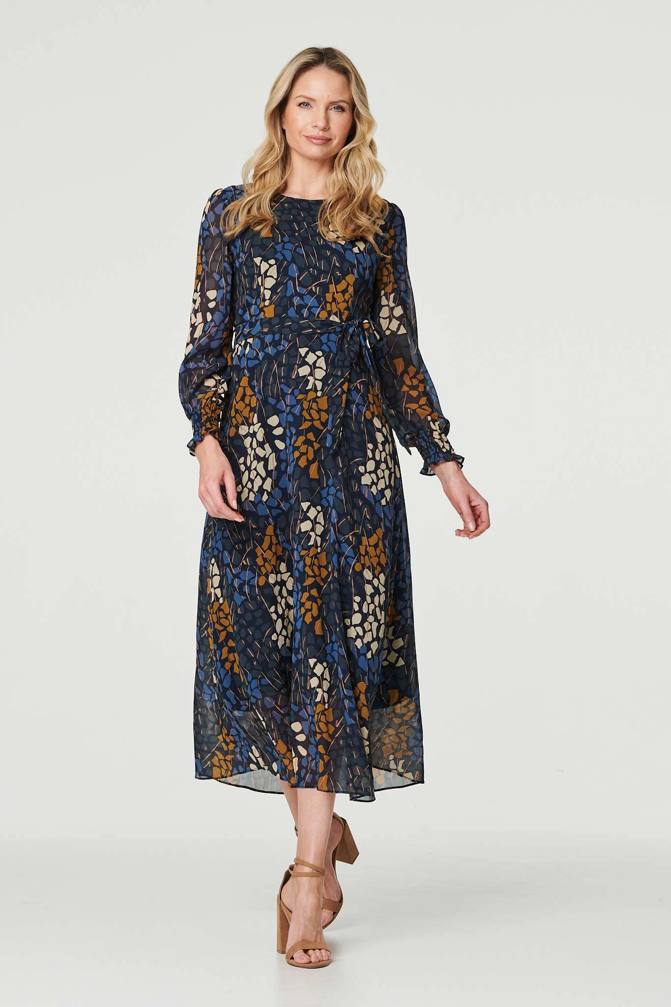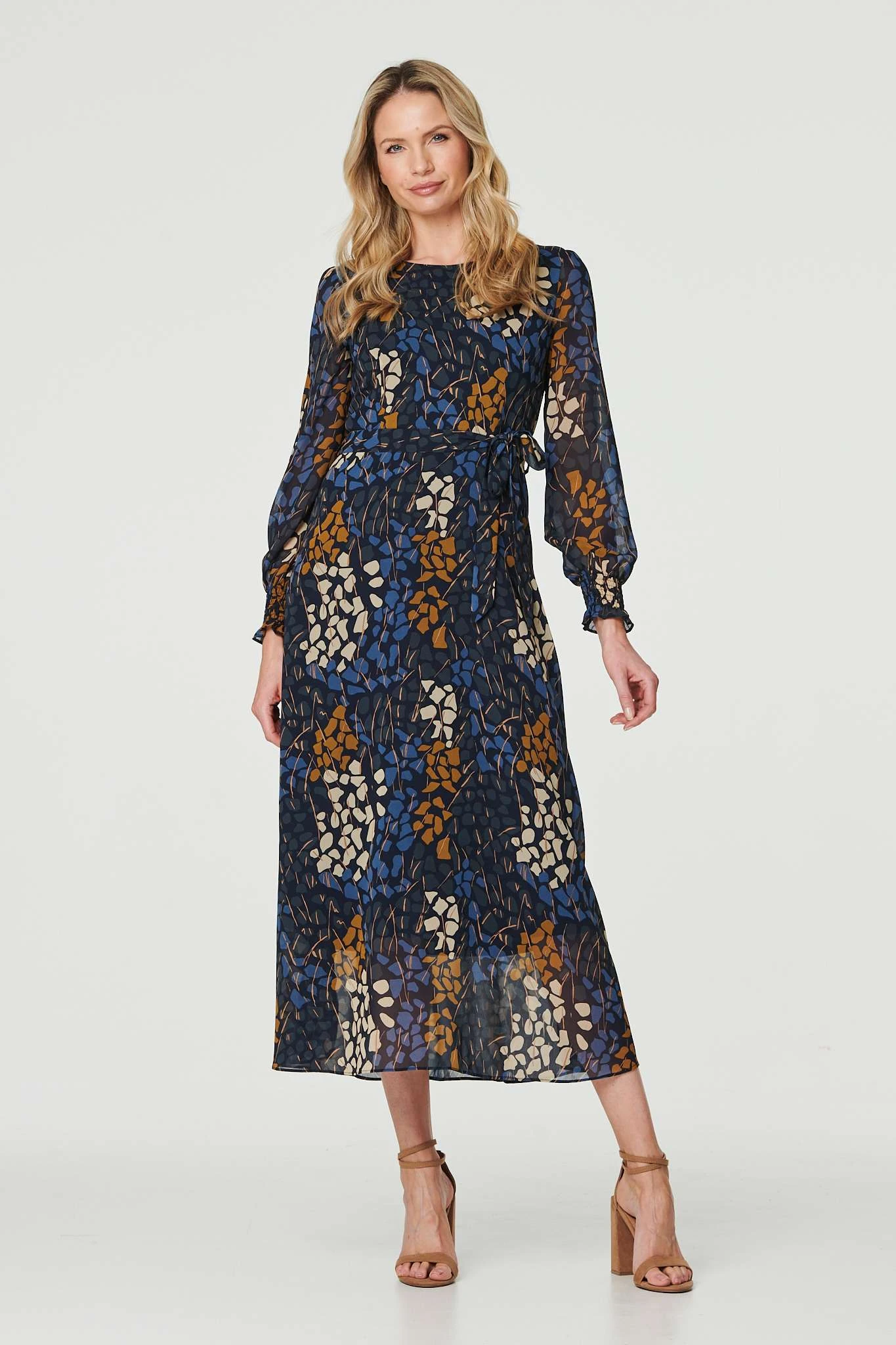 If you’re going for a more formal look, this dress is your new favourite. It has long semi sheer puff sleeves, a round neck and a sheer layered hem. The waist tie will flatter your figure and the midi length hem adds elegance to your look.