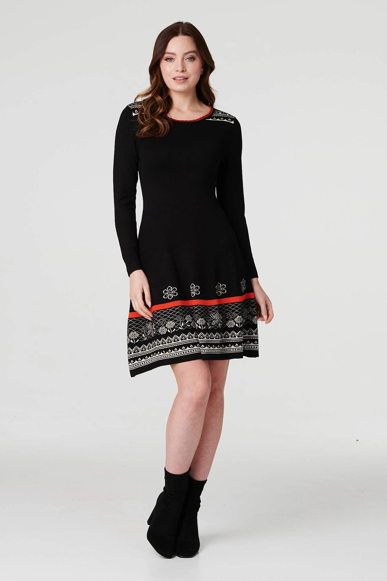 Add a figure flattering knit dress to your cold weather dress collection with this knitted fit & flare dress. Featuring a round neck, a removable scarf, long sleeves, a fitted bodice and a knee length skater skirt. Style with tights and a heeled knee high boots for a stylish everyday outfit.