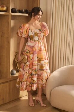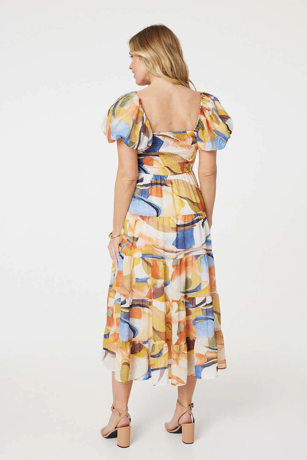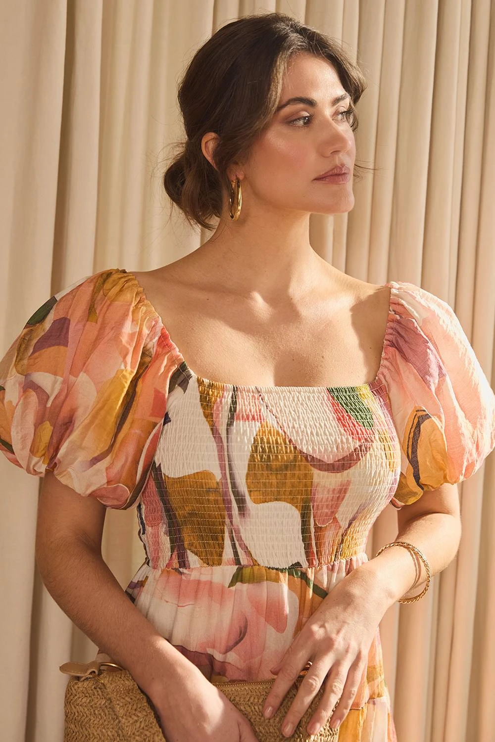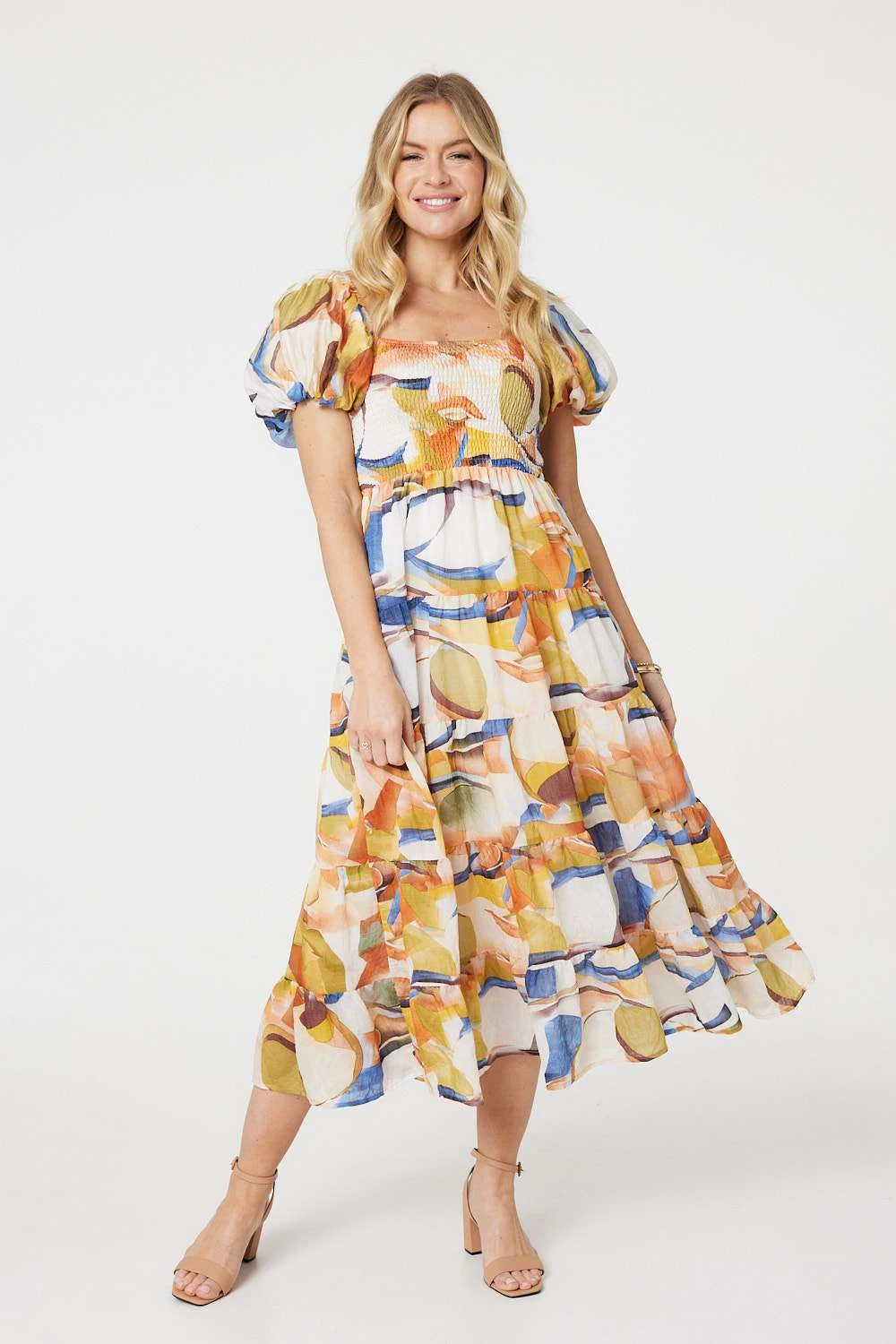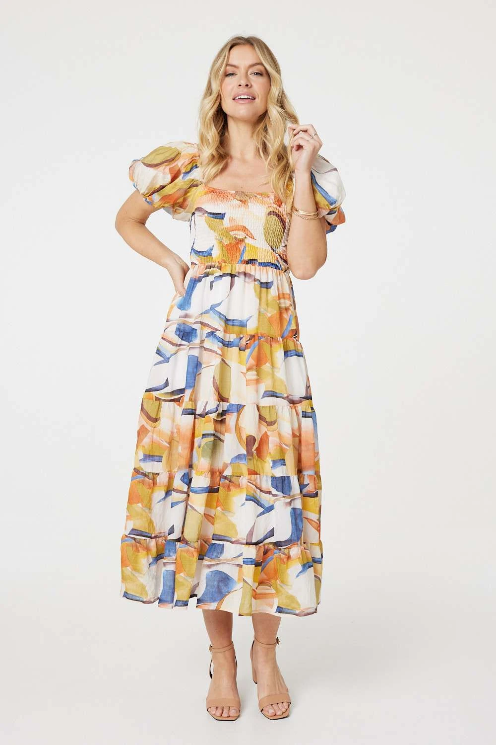 Add a statement maxi dress to your occasion wear closet with this vibrant printed style. It has a square neckline, short puff sleeves, a smocked bodice and a tiered midi length skirt. Pair with elegant neutral heels for warm weather look that’s perfect for a wedding or a day at the races.