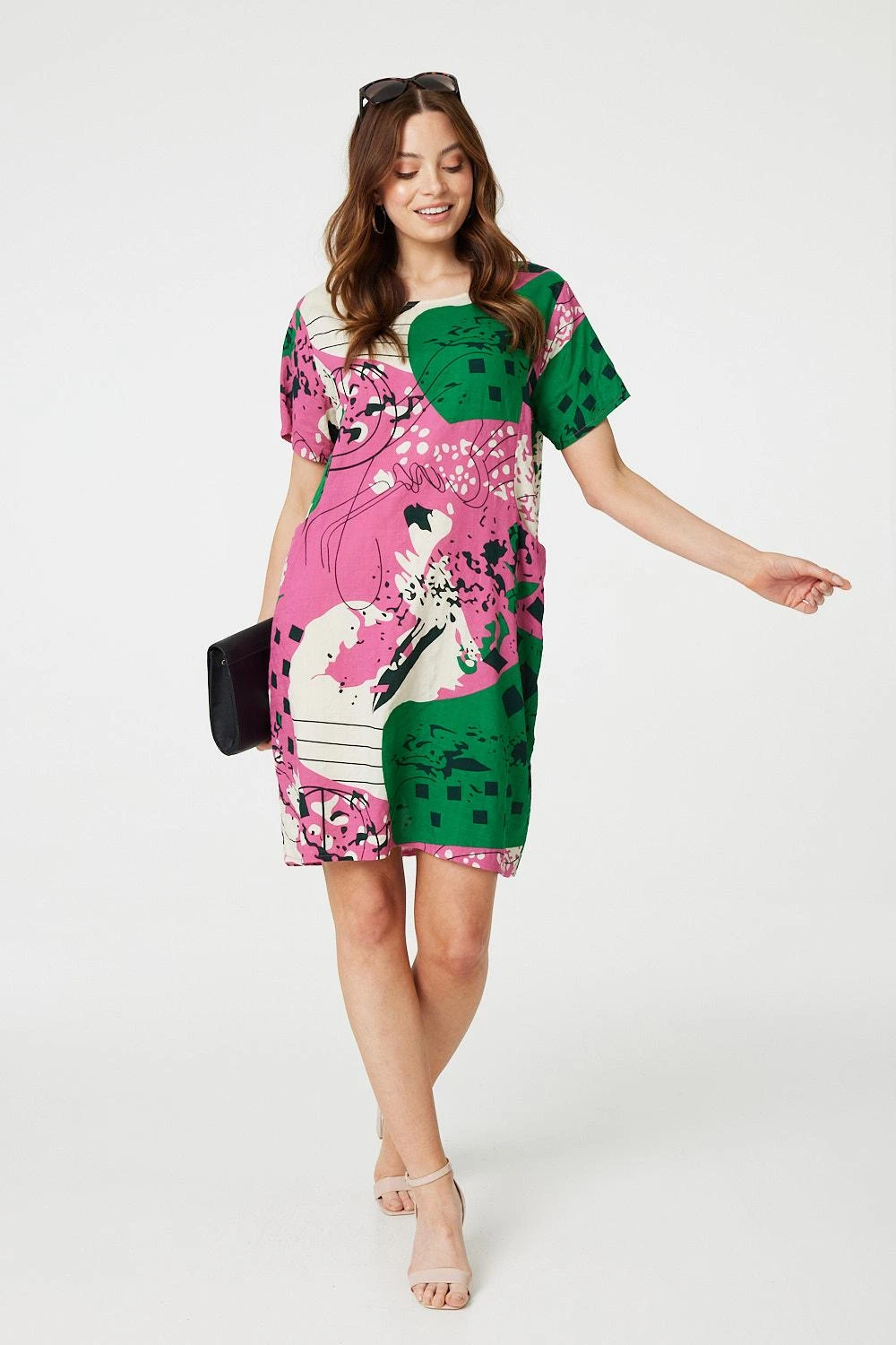 Stay cool and comfortable in this printed cotton shift dress. With a round neck, short sleeves, pockets, a loose fit tunic shape and a knee length skirt. Pair with flat sandals for an effortlessly comfortable daytime outfit.