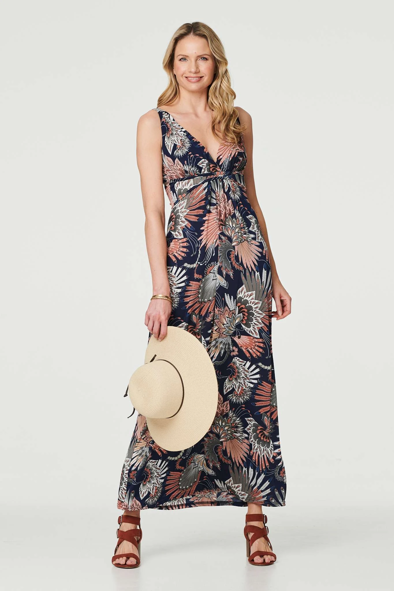 You’ll be ready for the sunshine in this maxi sun dress. It has a flattering empire fit with a v-neck and an A-line maxi skirt. Complete the look with a floppy sun hat and your most comfortable sandals.