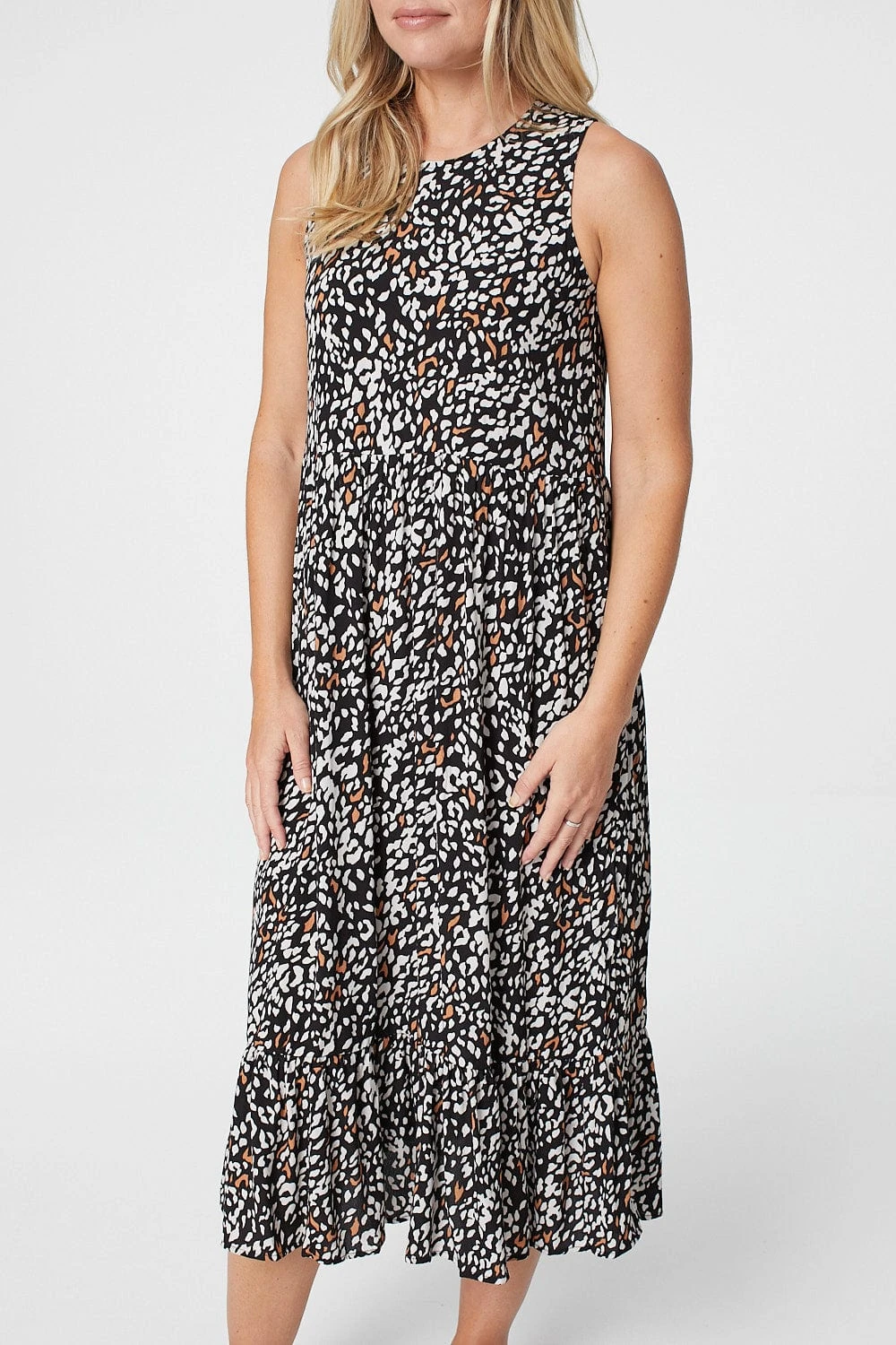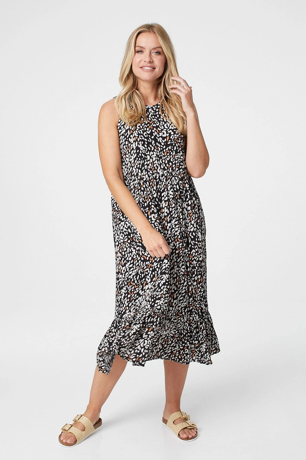 Add a bold printed dress to your collection with this smock dress. With a round neck, a sleeveless fit and a tiered midi skirt. Pair with flat sandals and a denim jacket for a weekend ready outfit.