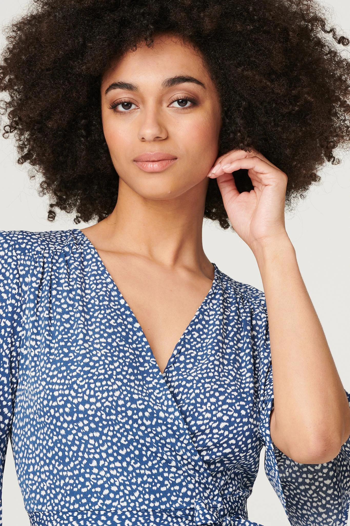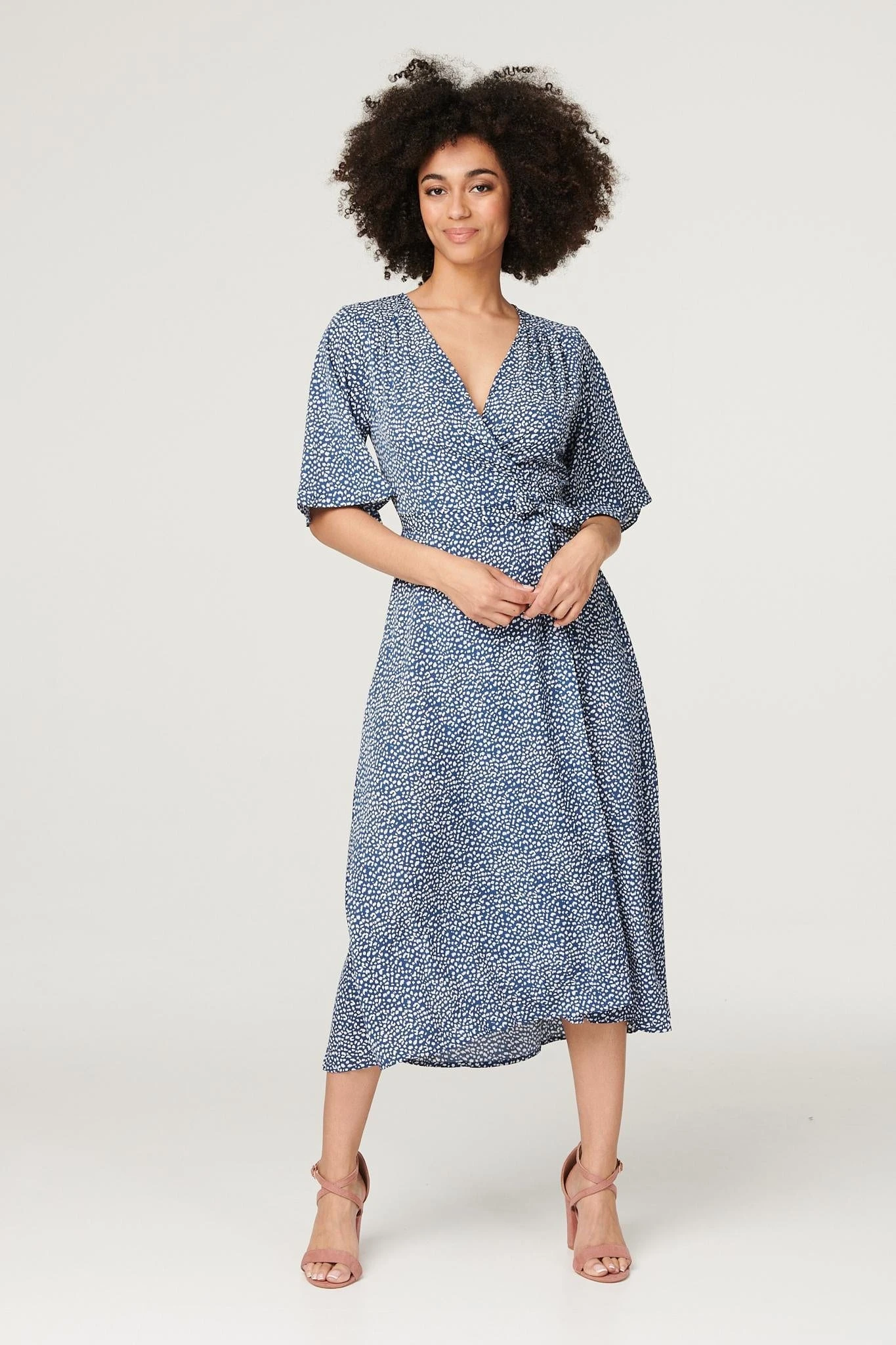 Every capsule wardrobe needs a versatile wrap dress like this one. It has a V-neck, 1/2 length flute sleeves and an A-line midi skirt with a front split. Pair with neutral heels for a chic style you can wear for any daytime occasion.
