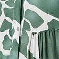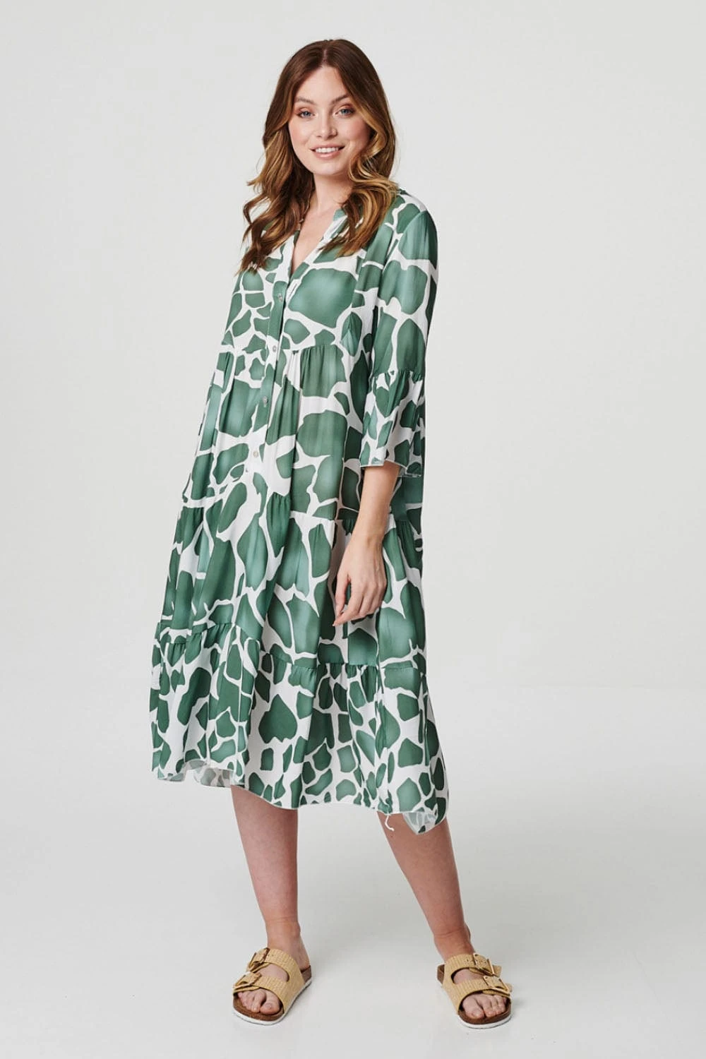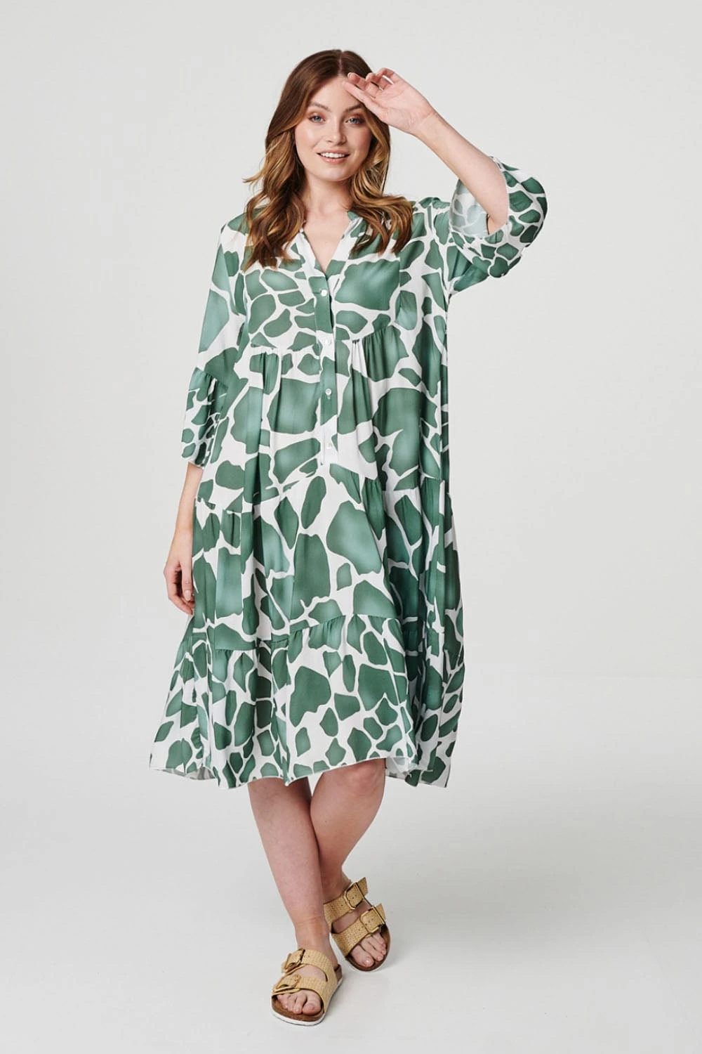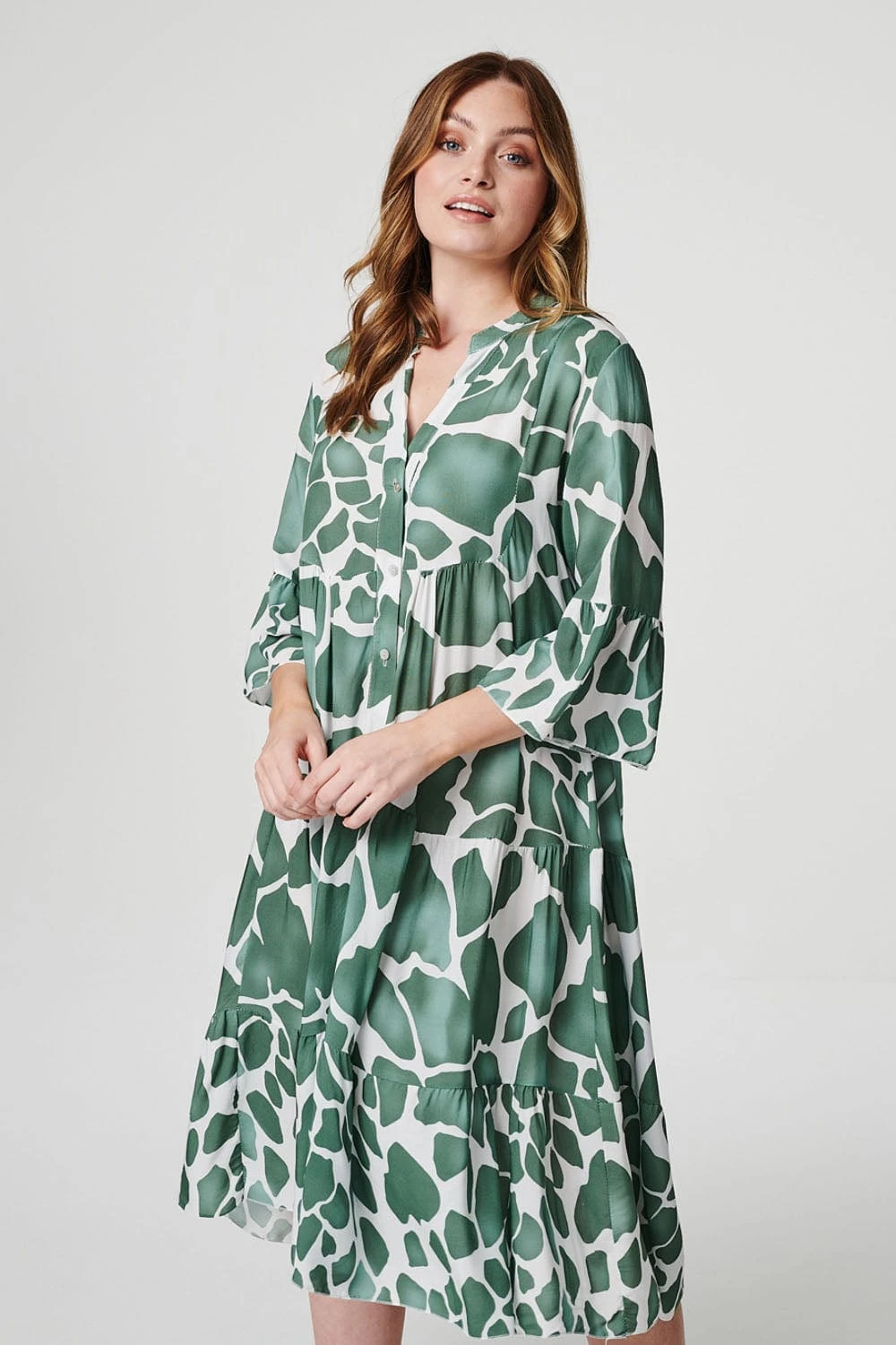 Add a bold printed smock dress to your collection with this abstract print midi dress. With a collarless v-neck, a button detail front, 3/4 length flared cuff sleeves and a below the knee tiered skirt.