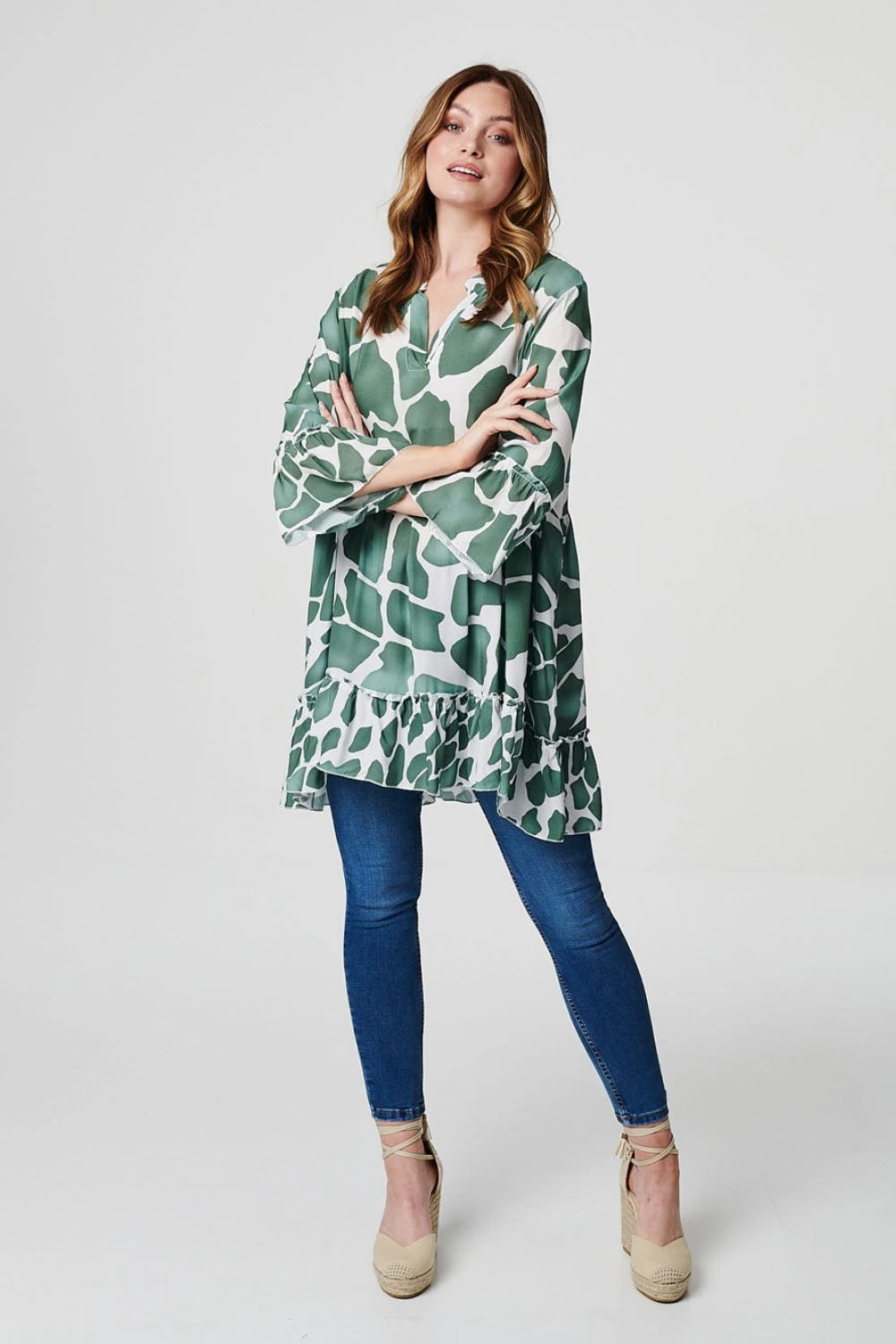 Add a statement making abstract printed smock dress to your closet. With a collarless v-neck, 3/4 flared cuff sleeves, a tiered full smock skirt and a short fit. Pair with jeans and sandals for a warm weather friendly daytime look.