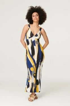 Add a bold print to your wardrobe with this maxi sun dress. It has a V-neck, wide cami straps, a twist front detail, fitted silhouette and a column-shaped maxi length skirt. Made from a non-iron stretch fabric, it’s perfect for a holiday capsule closet. Pair with sandals or heeled espadrilles for a chic warm weather style.