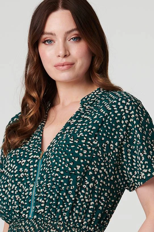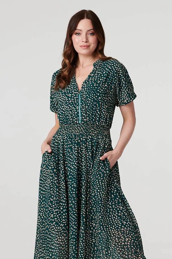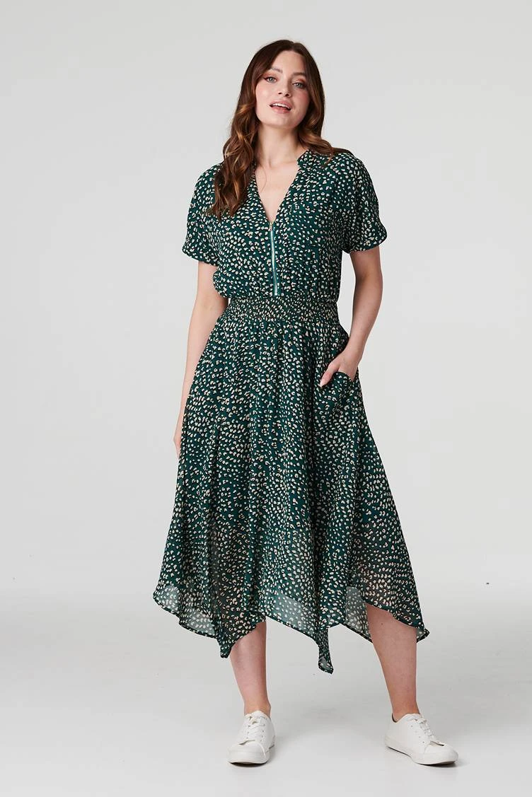 No dress collection is complete without a printed hanky hem dress like this ditsy print midi dress. With a zip front, v-neck, short sleeves with a turn-up cuff, a comfortable smocked stretch waistband, hidden pockets and a floaty hanky hem. Dress down with trainers and a denim jacket for the weekend or add a pair of kitten heels for the office.