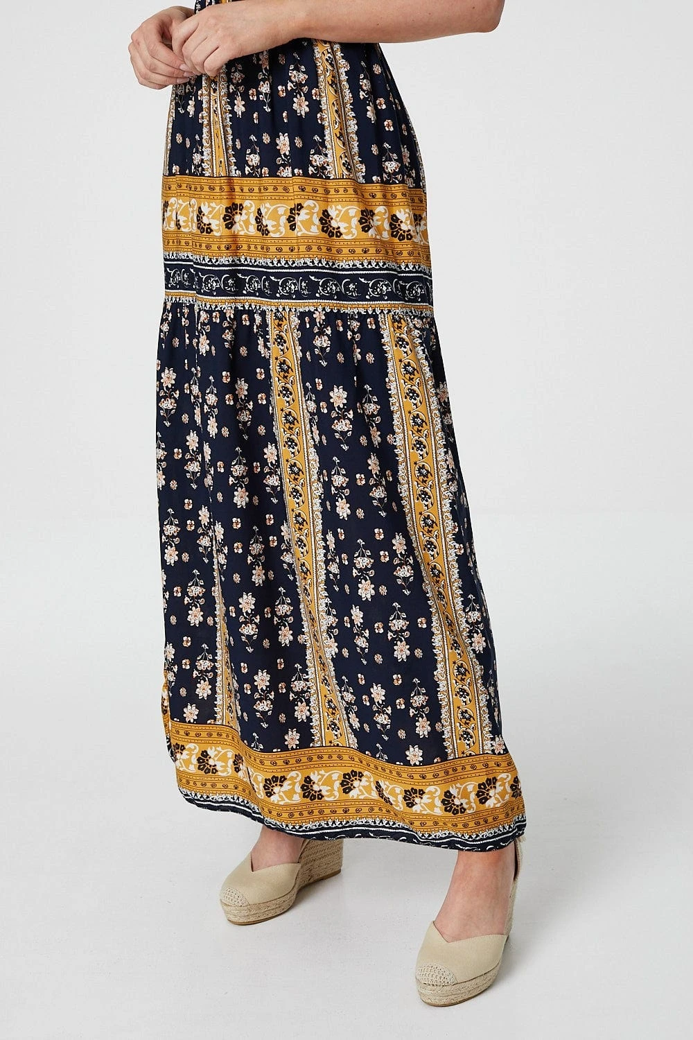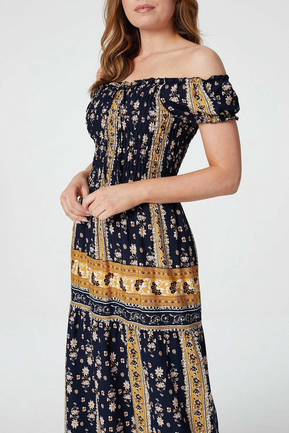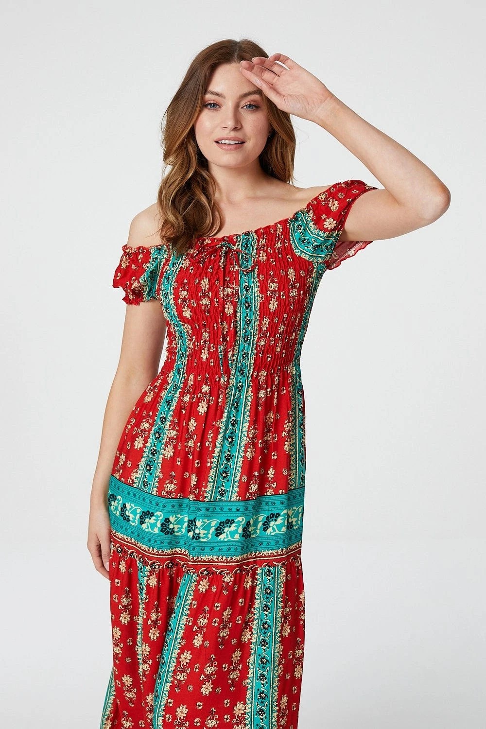 Add a statement making printed off the shoulder maxi dress to your closet with this retro print dress. With a bardot neckline, cap sleeves, a shirred bodice, a full length straight skirt with a border print detail. Pair with flat strappy sandals for the ultimate comfortable daytime look or with nude espadrille wedges for a weekend wedding.
