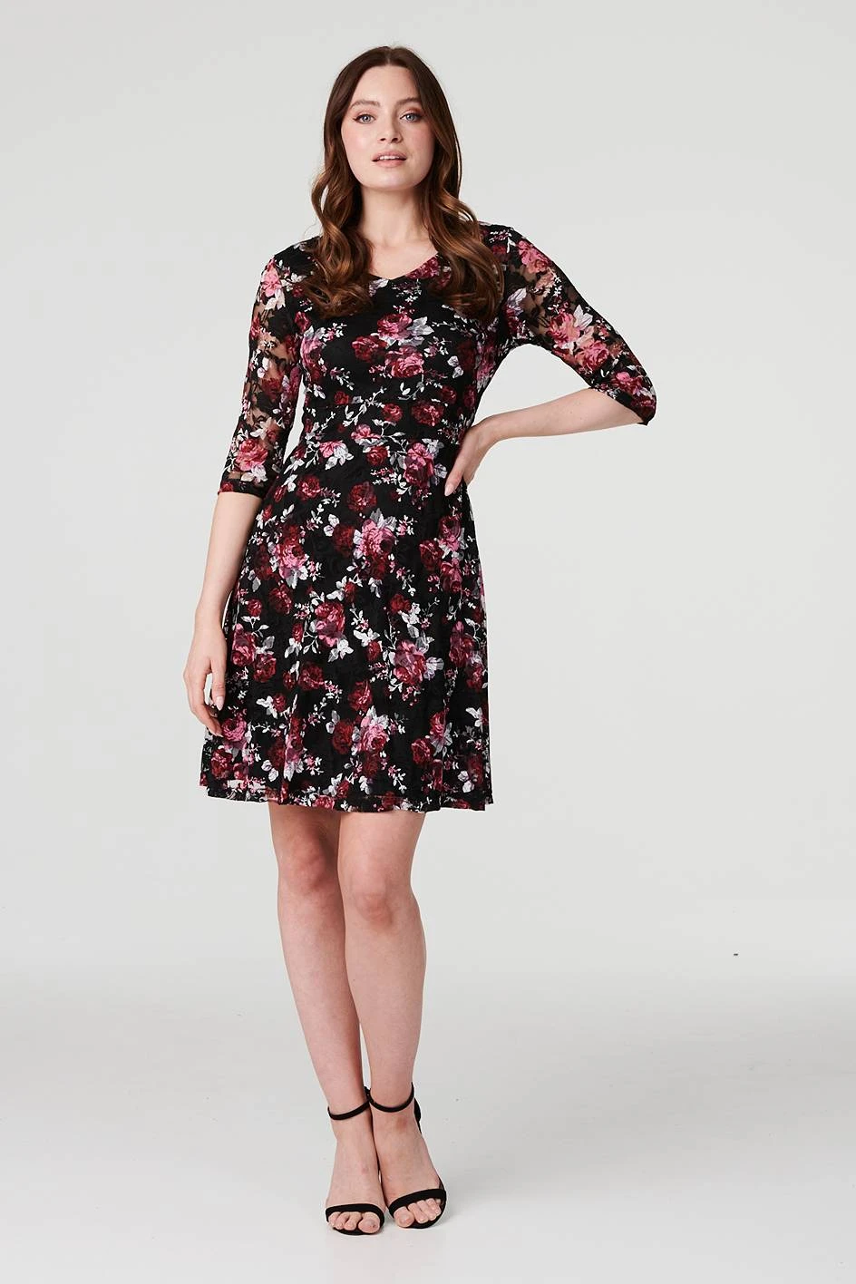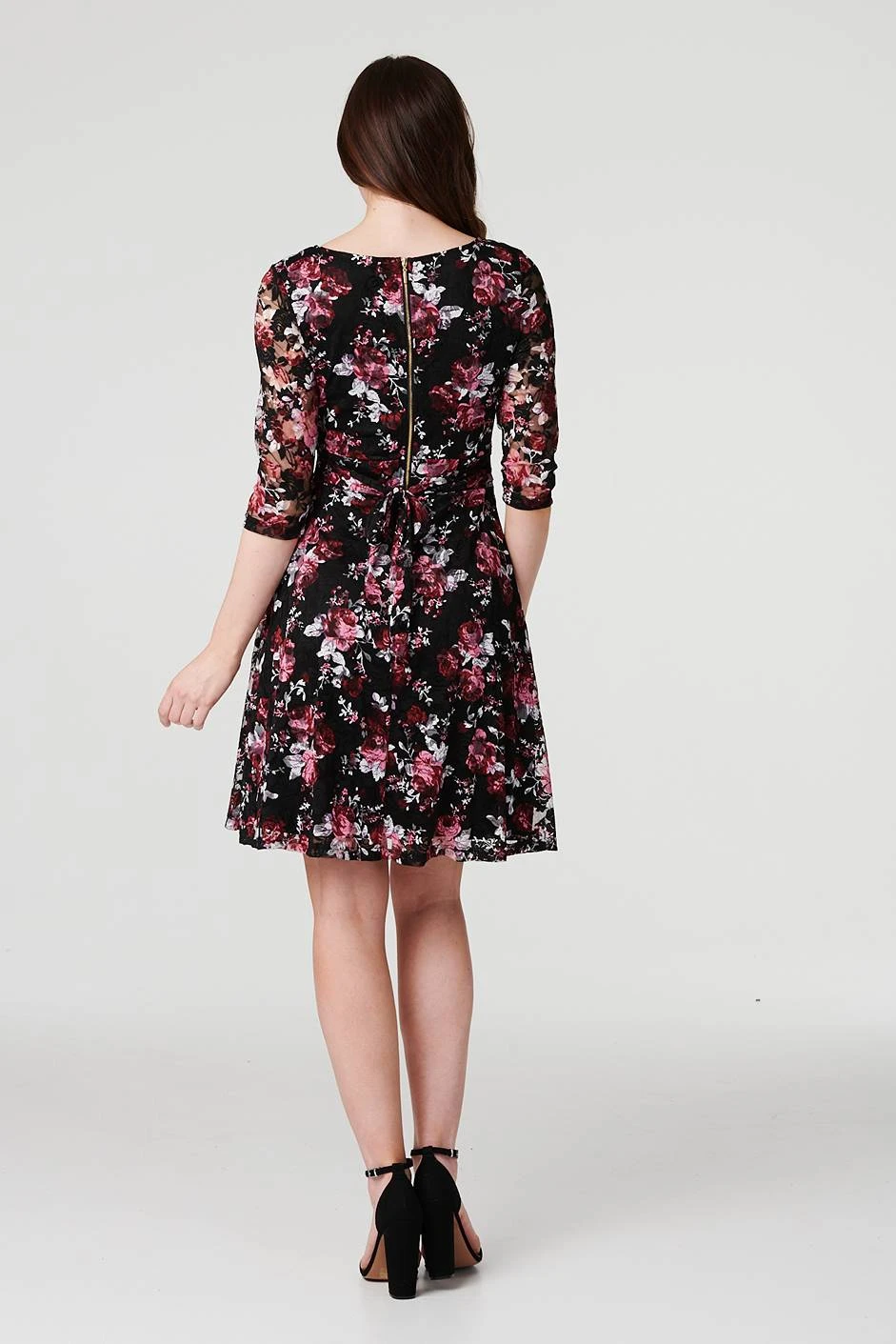 Make a statement all season with this rose print lace skater dress. With a v-neck, sheer 3/4 sleeves, a zip back, a self-tie detail and a short fit & flare skirt. Pair with black kitten heels and a blazer for a chic and stylish work look or dress up with strappy heels and a clutch bag for drinks with the girls.