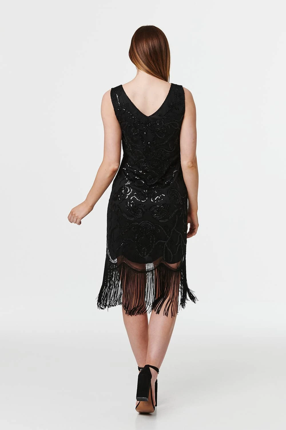 Every collection needs a glamorous evening dress like this embellished sequin slip dress. With a v-neck, sleeveless fit, a v-back detail, a delicate embroidered bodice and a midi length fringed hem. Pair with black strappy heels for a chic formal event look.