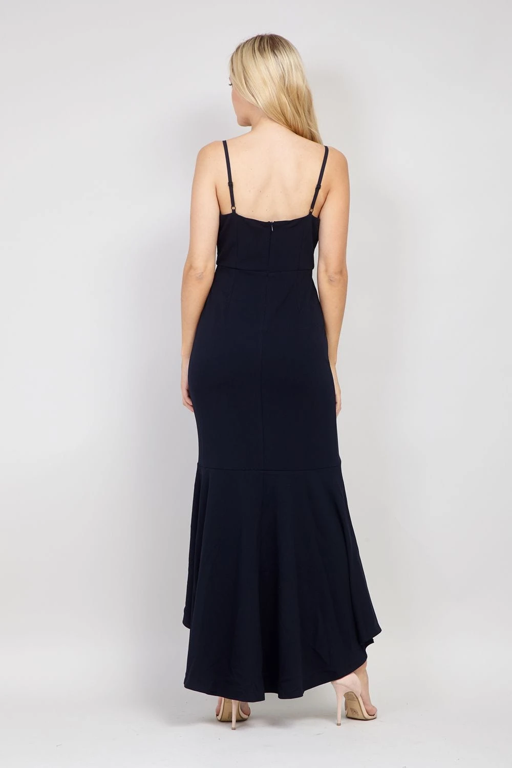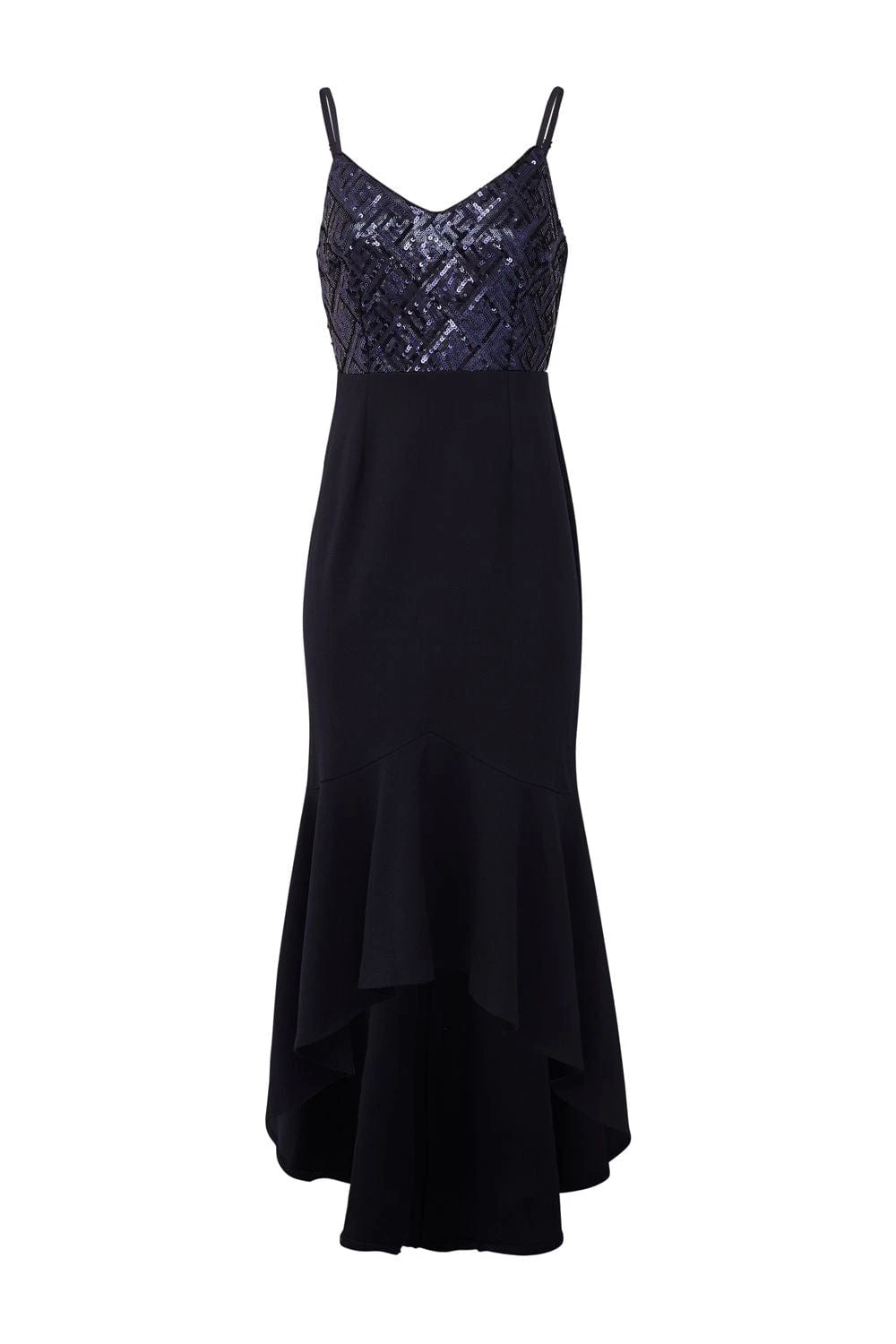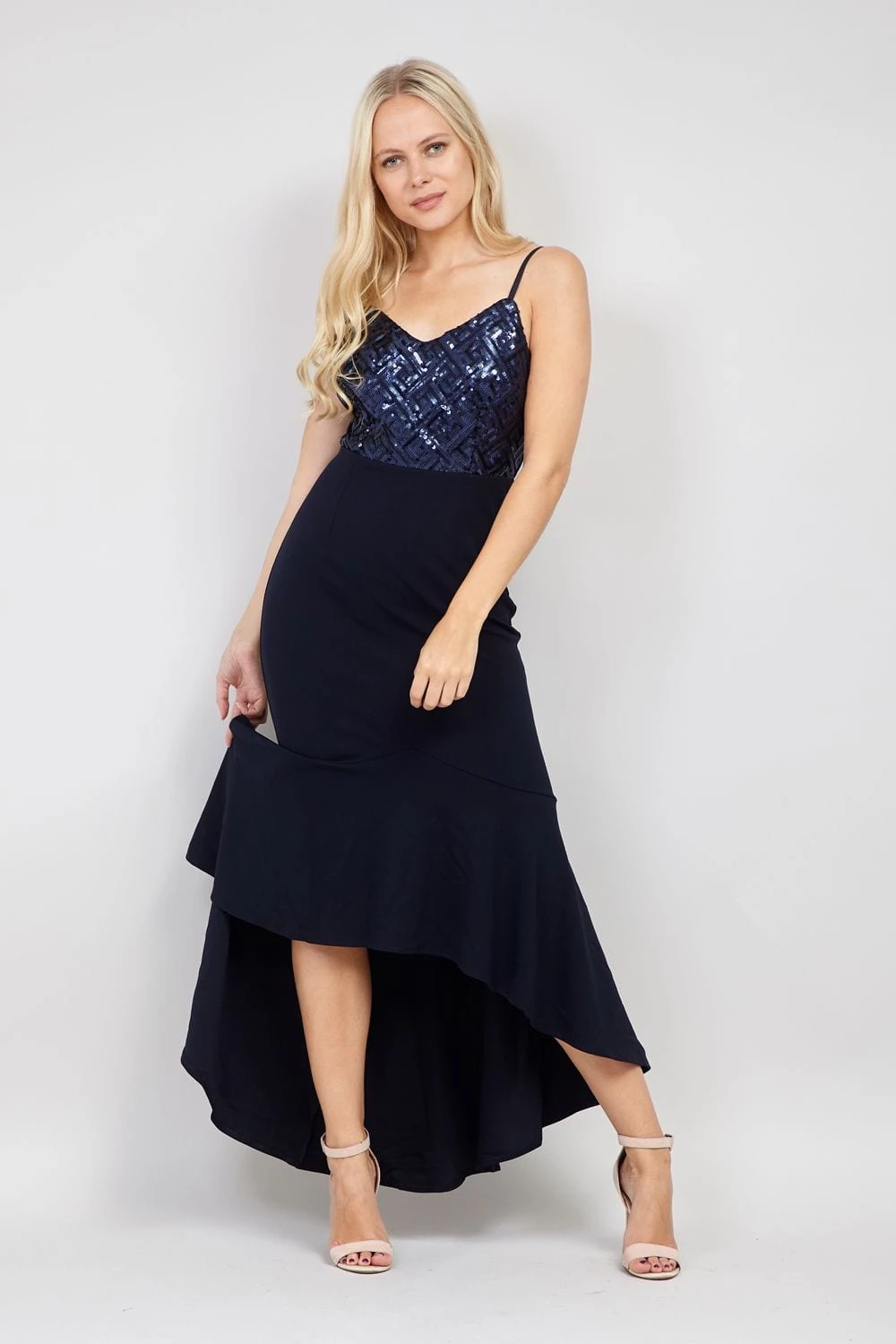 Make a statement this occasion season in this stunning sequin top maxi dress. It has a high low hem, cami straps and a v-neck, itโs simply stunning. Complete the glam look with strappy heels.