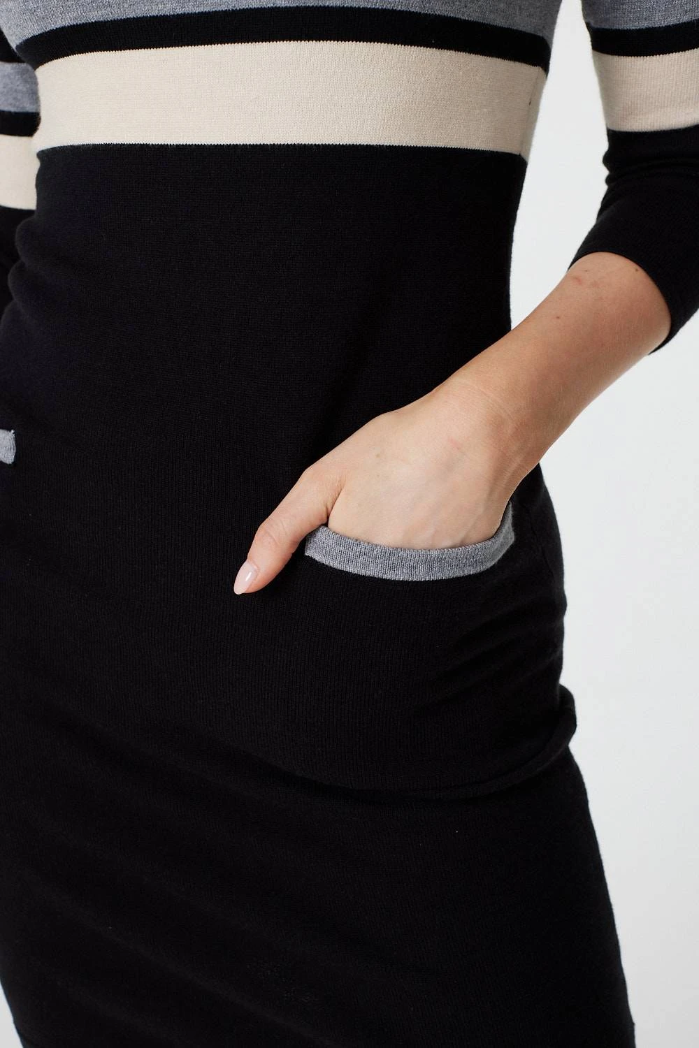 Add a chic striped knitted bodycon dress to your closet this season. With a round neck, 1/2 sleeves, front pockets and a slim fitting skirt sitting above the knee. Style with heeled ankle boots for an effortless day to night outfit.