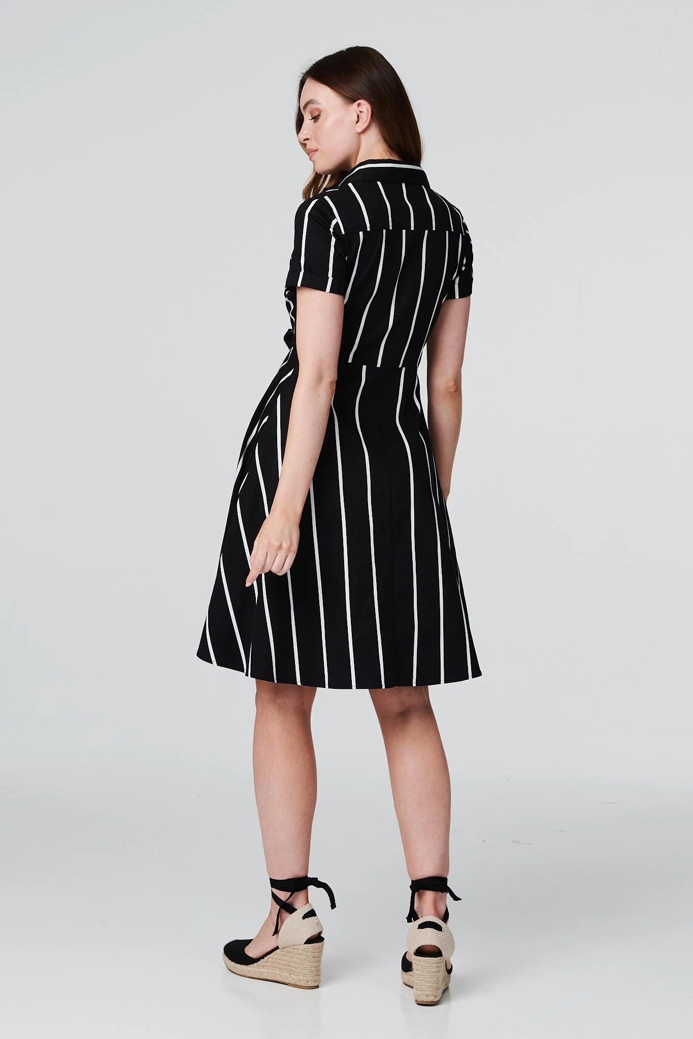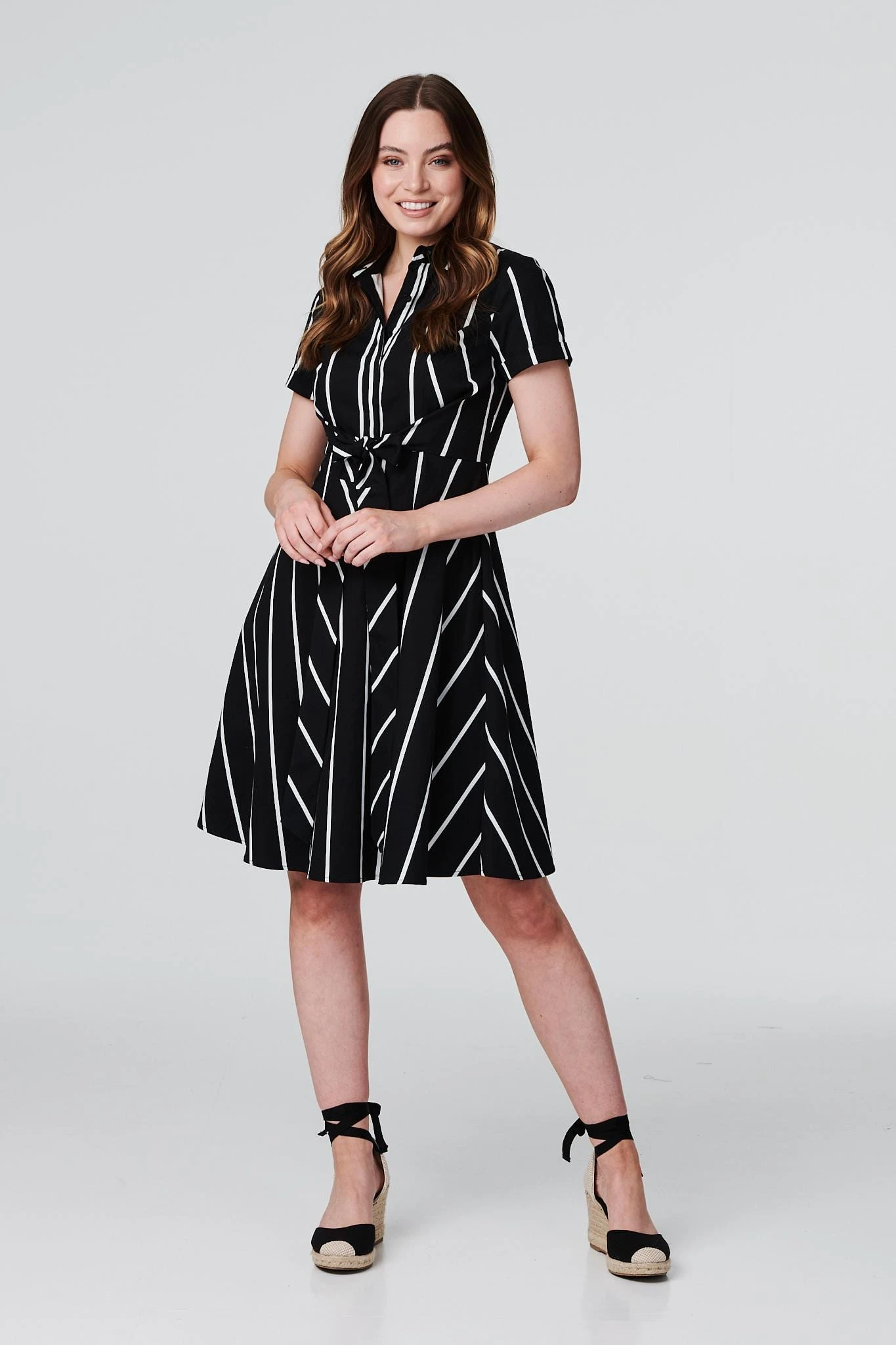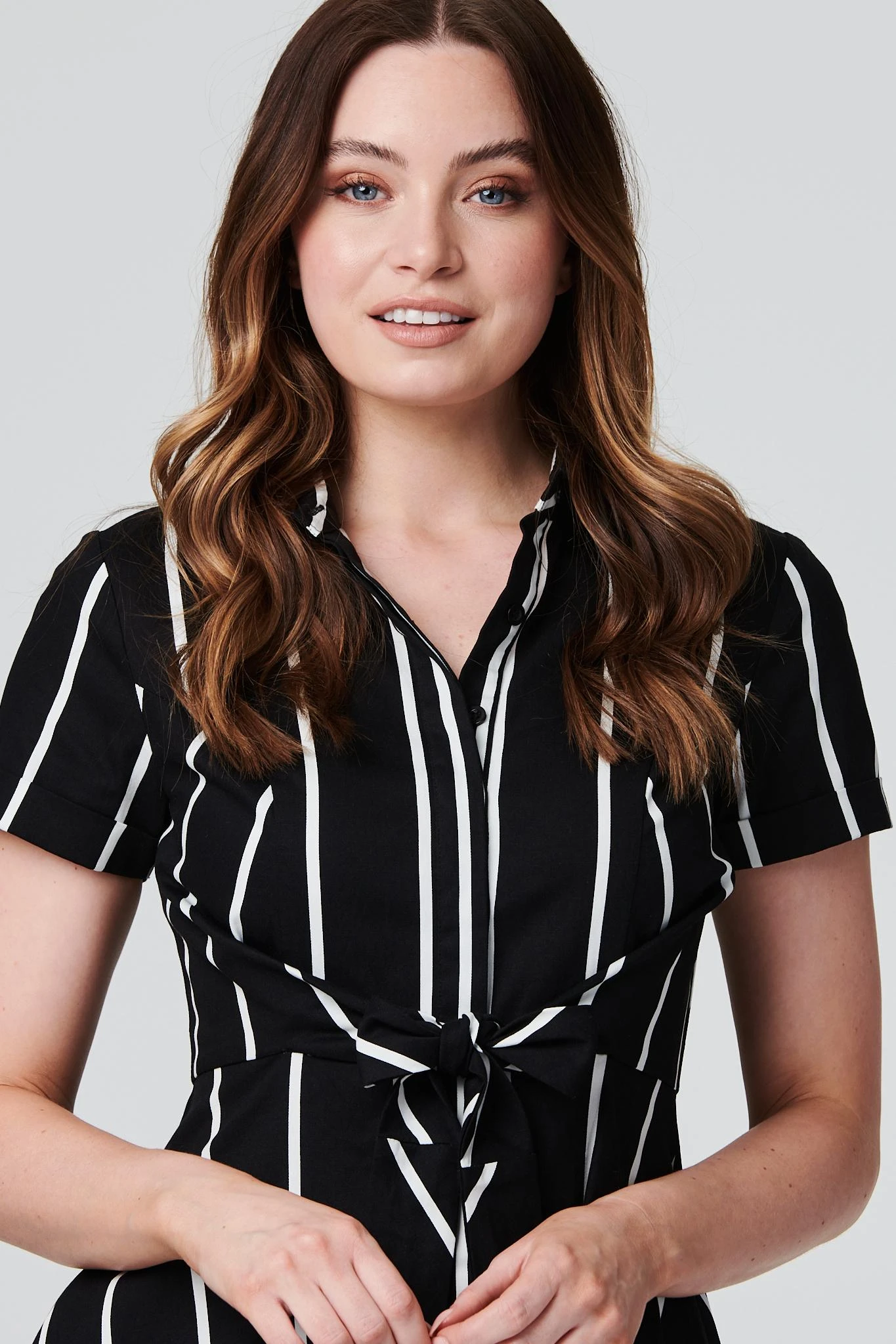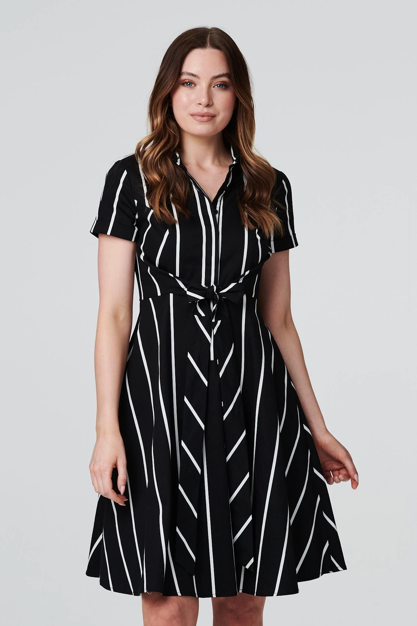 Add a tailored style to your wardrobe with this bold striped shirt dress. It has a collared v-neck, button front, a self tie knot front detail, short sleeves, pockets and a short skirt sitting just above the knee. Made from a comfortable stretch cotton fabric, there’s no need to iron, simply grab and go! Team with heeled wedges or fresh neutral trainers for a look that equally perfect for a weekend brunch with friends or a day at the office.