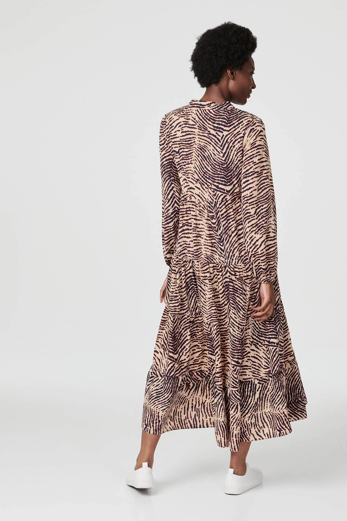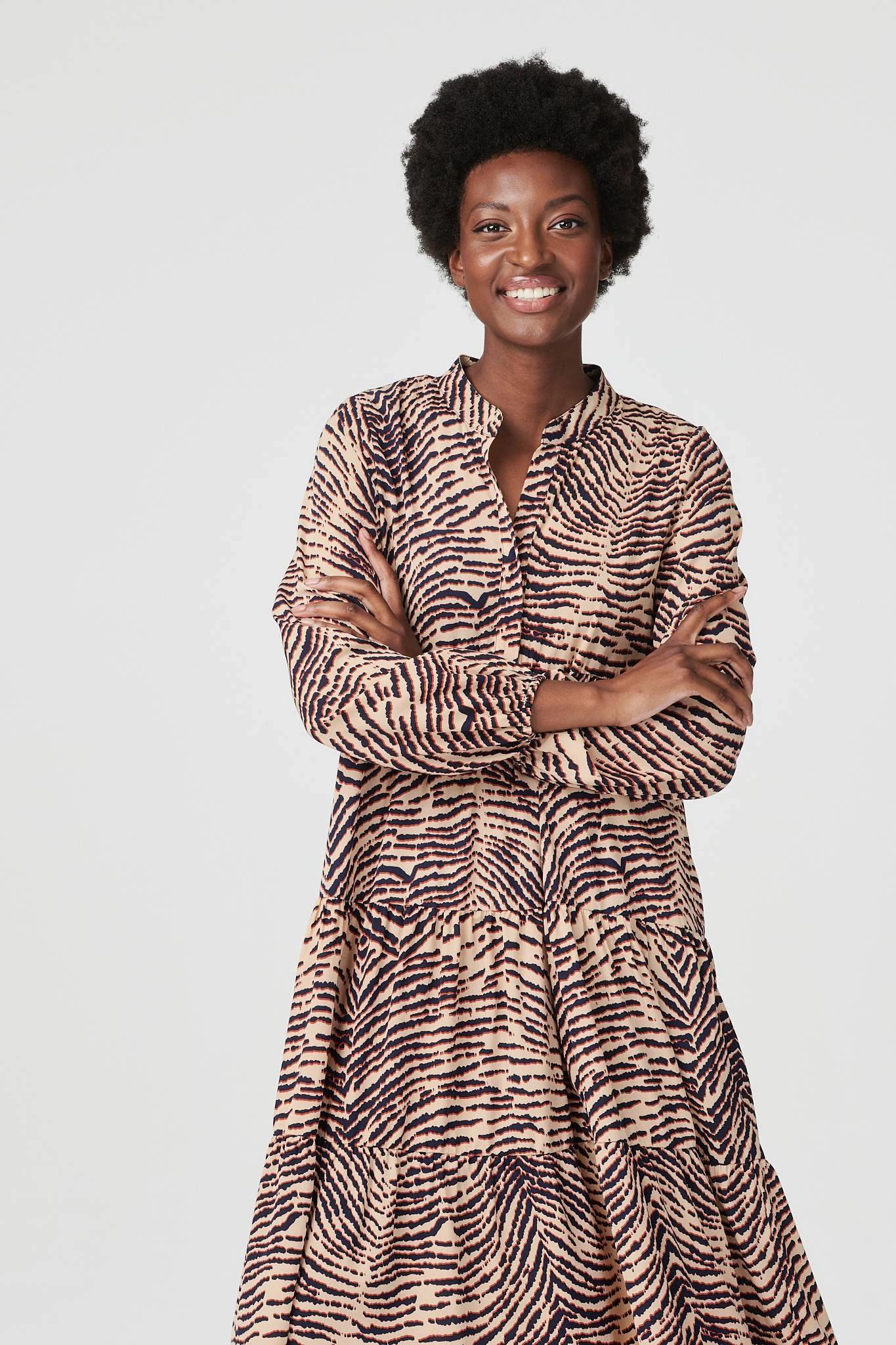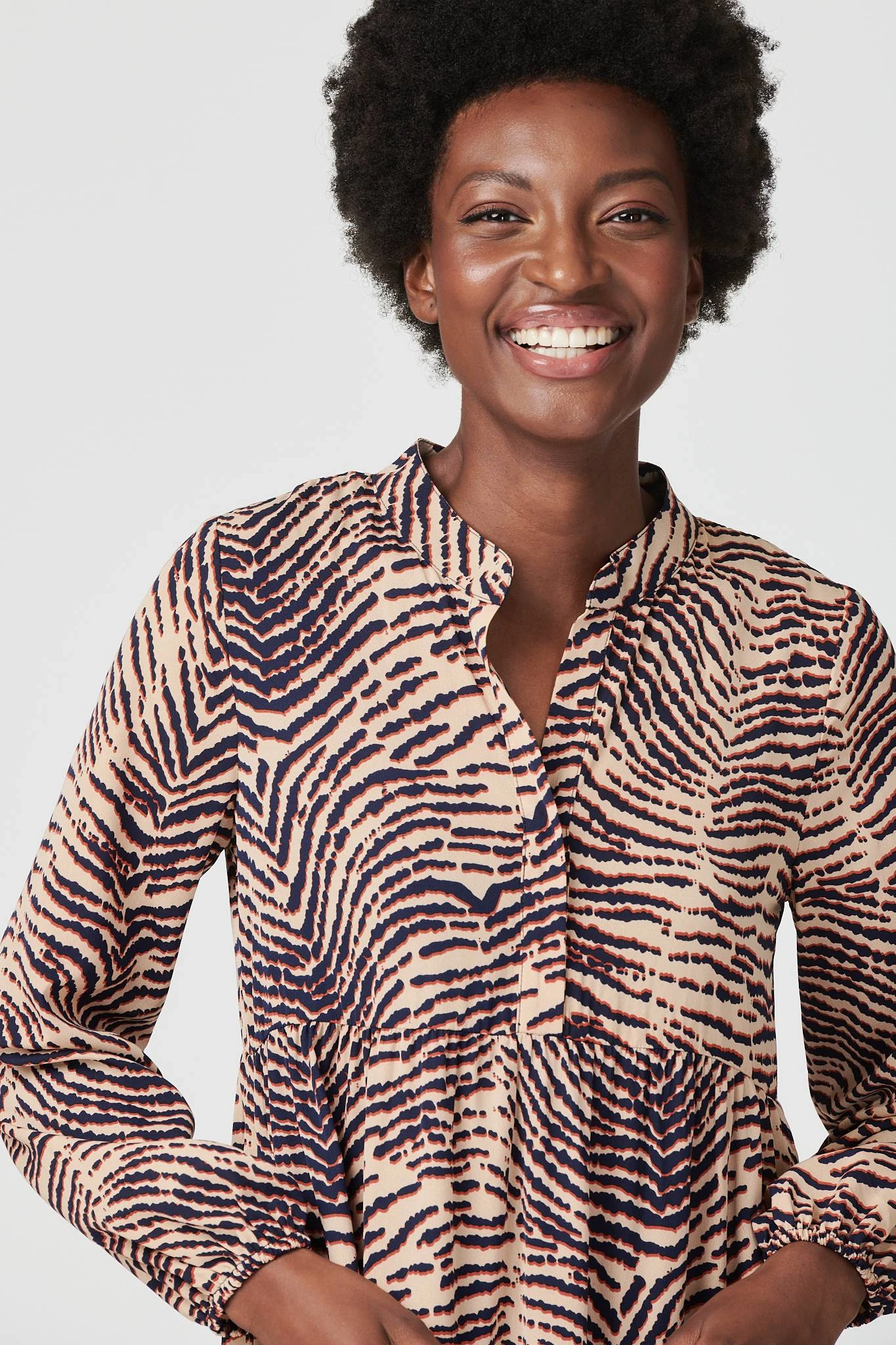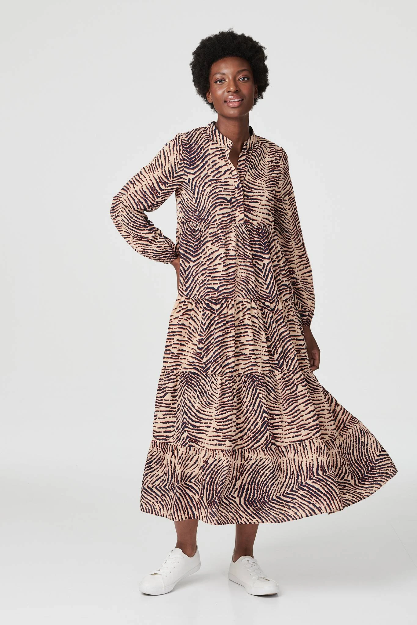 Add a stylish striped smock dress to your casual closet. With a v-neck, 1/2 button front, long sleeves and a tiered smock skirt sitting above the ankle. Style with trainers for an effortless off-duty look.