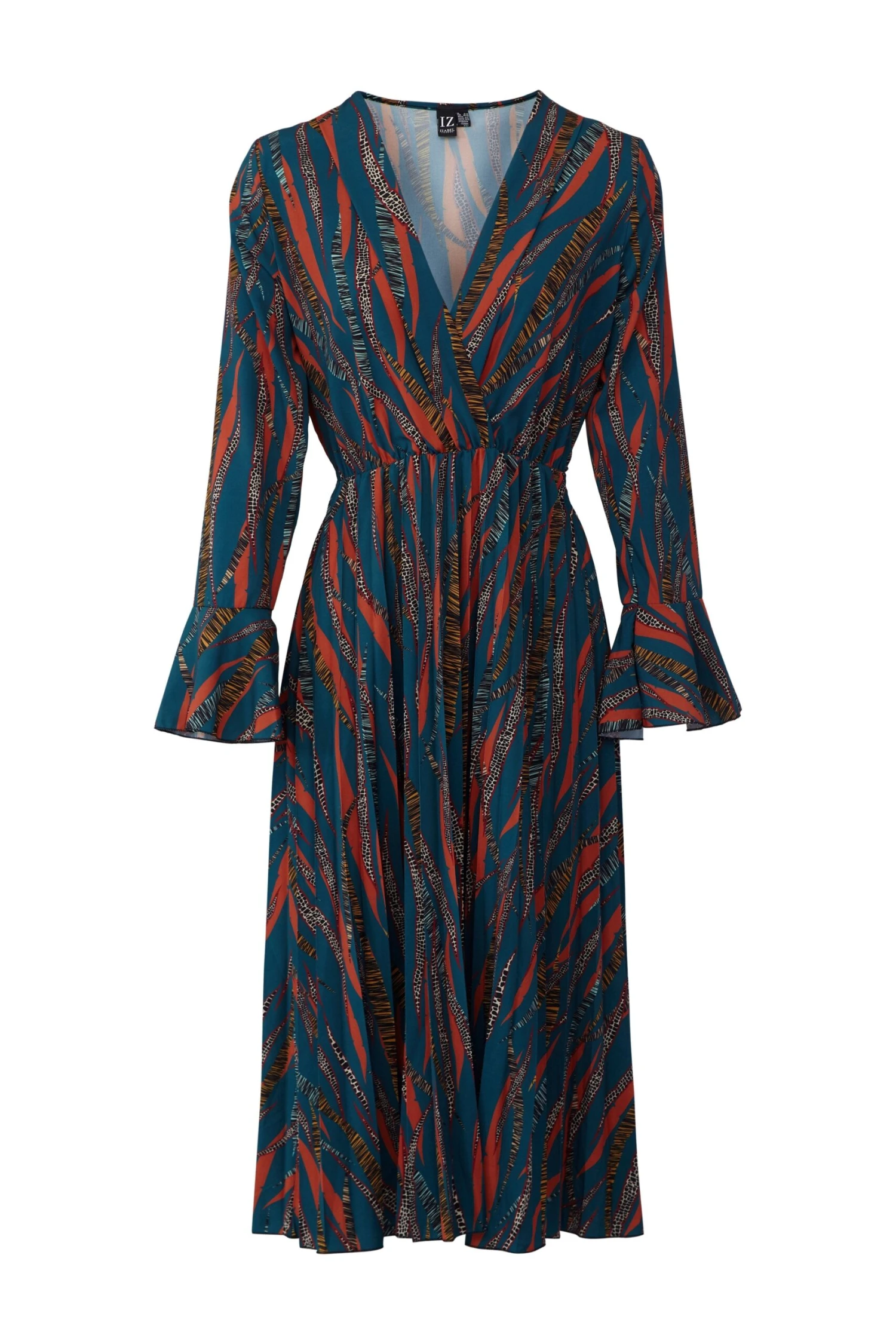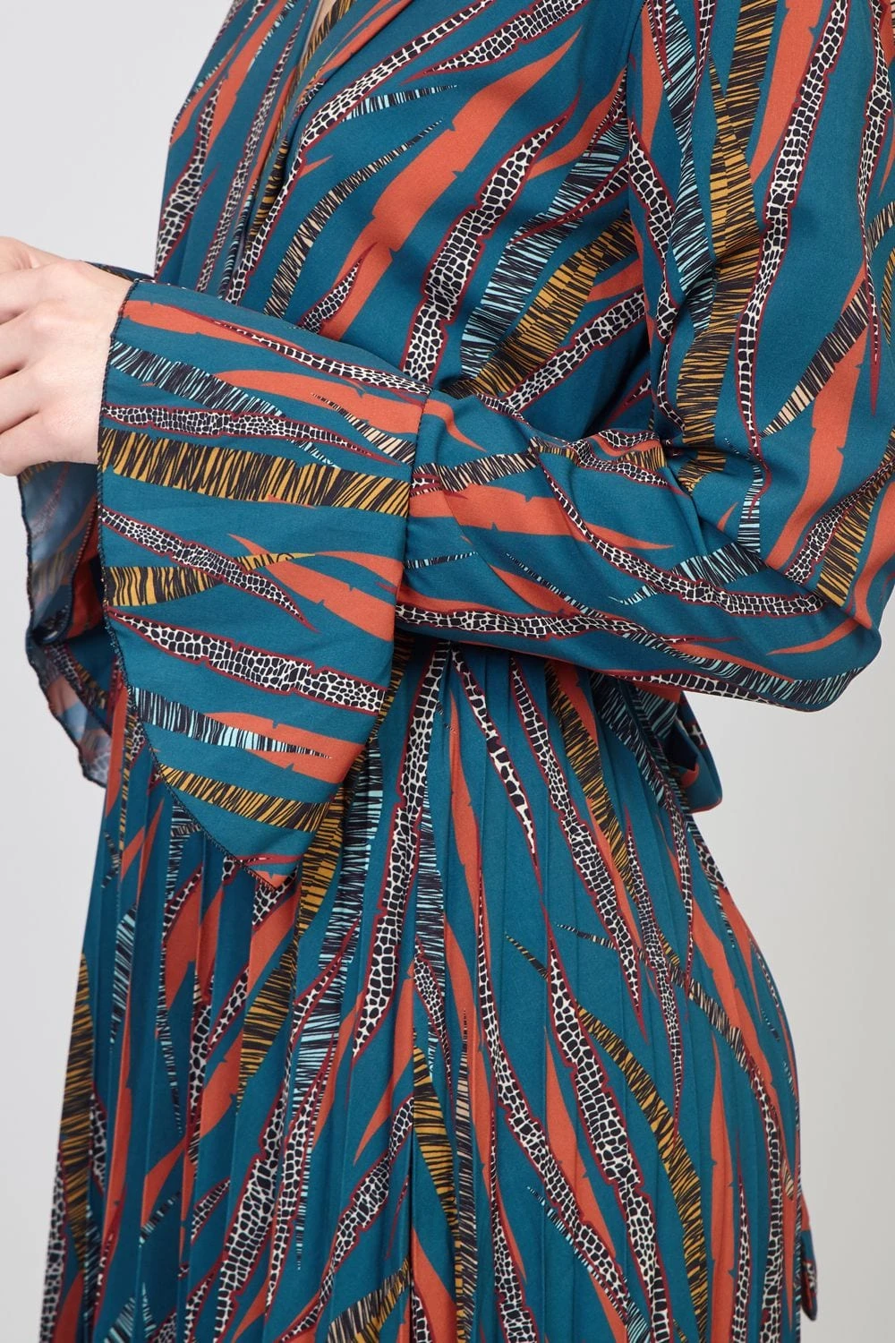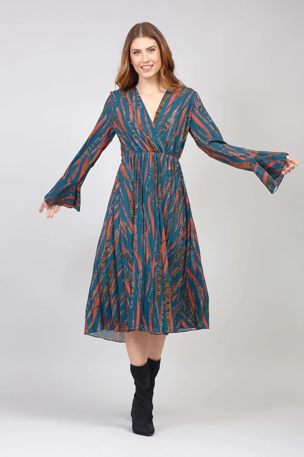 Dress up for your next event in this Aztec fit and flare dress. It comes with a cinched waist with a plunge neck, long flared sleeves and a in midi length. Wear with courts and statement earrings.