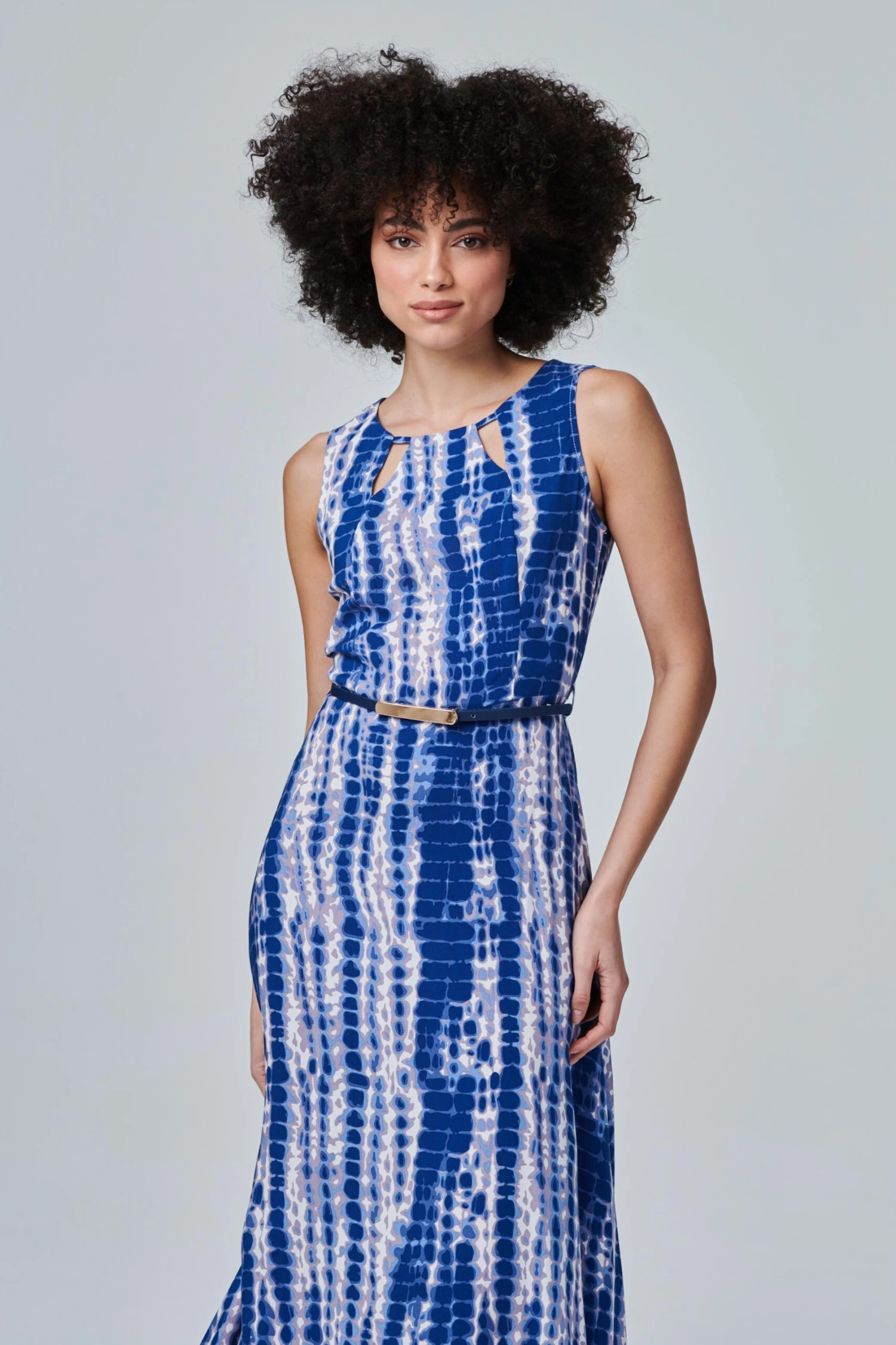 Make a statement with this 100% viscose sleeveless tie dye maxi dress. It has a round neck with a with a cut out front detail, a detachable belt and an a-line maxi skirt. Team with neutral heels for a smart daytime look.