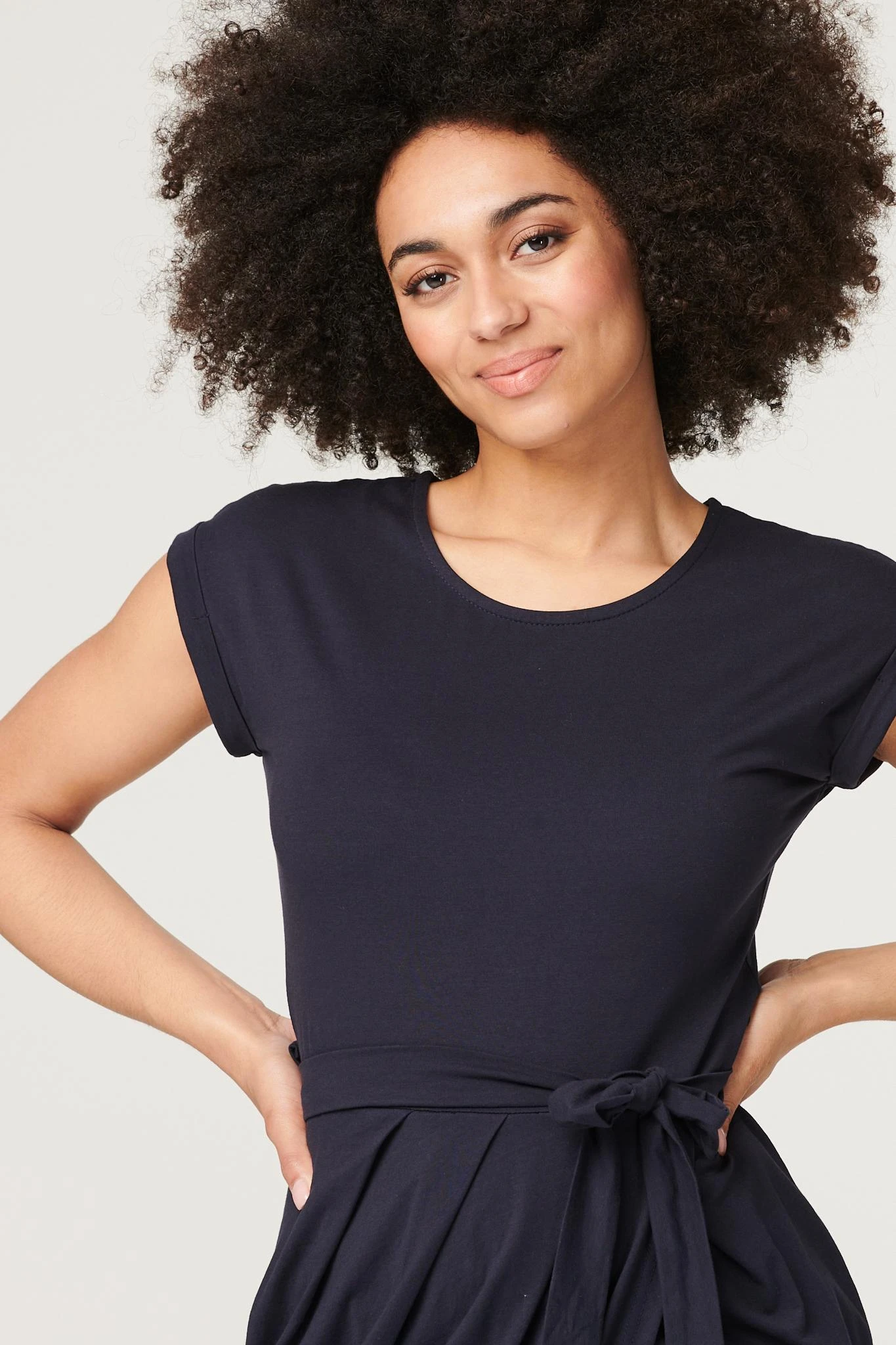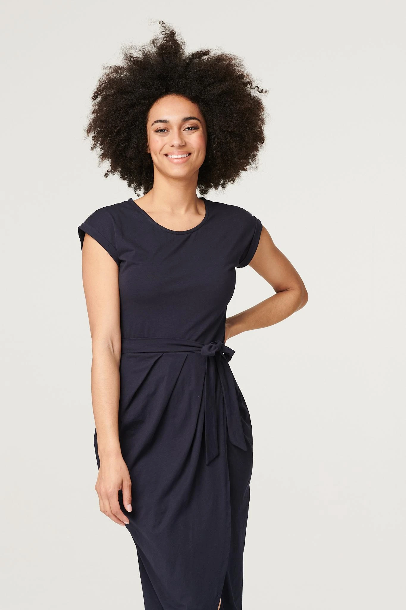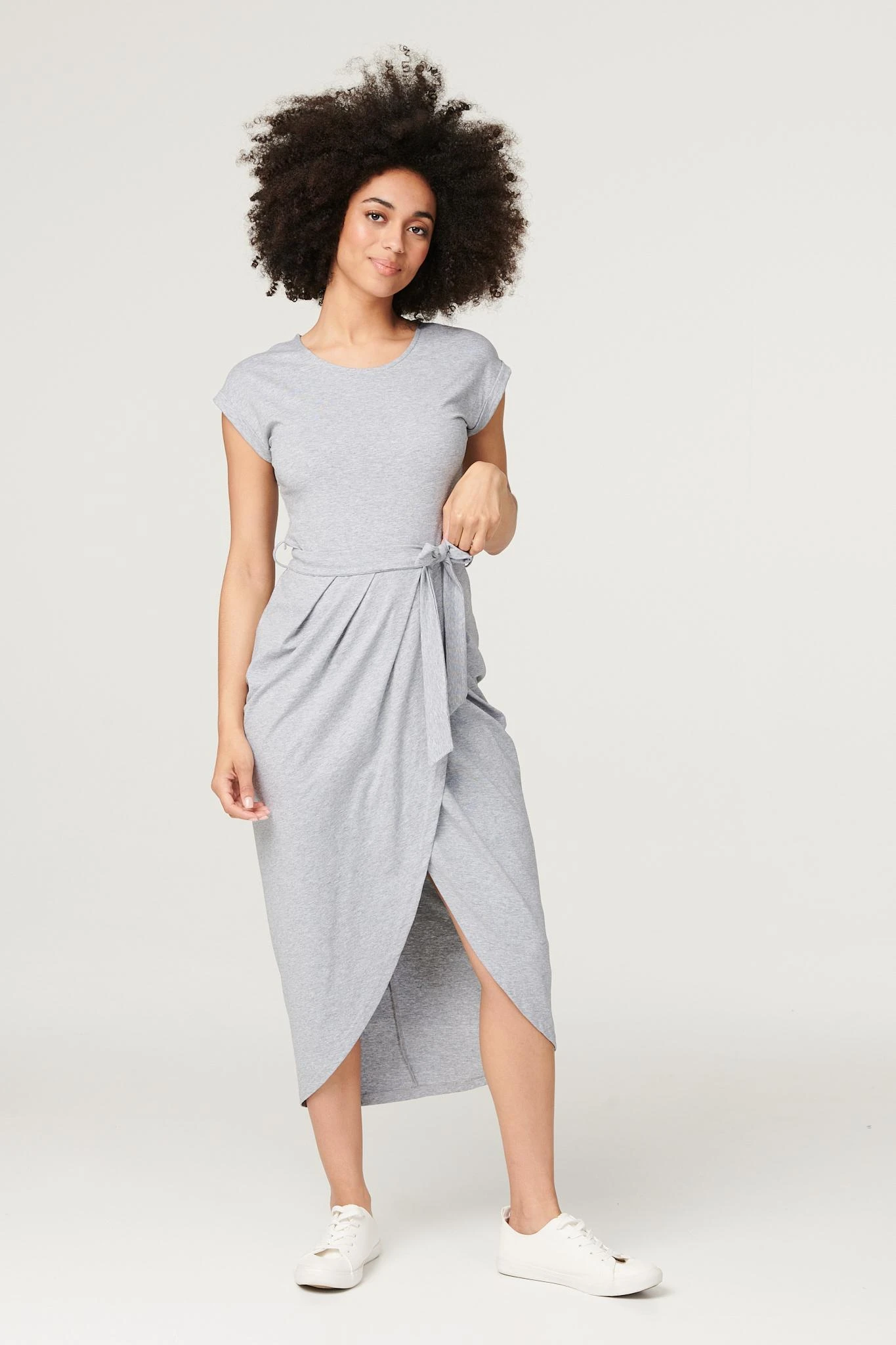 Elevate your off-duty look with this flattering yet comfortable tulip dress. Made from a soft stretch jersey fabric, it has a round neck, short turn-up sleeves, a removeable self-tie belt and a tulip shape midi length skirt. Team with fresh white trainers and layer with a cropped denim jacket for an on trend weekend style.