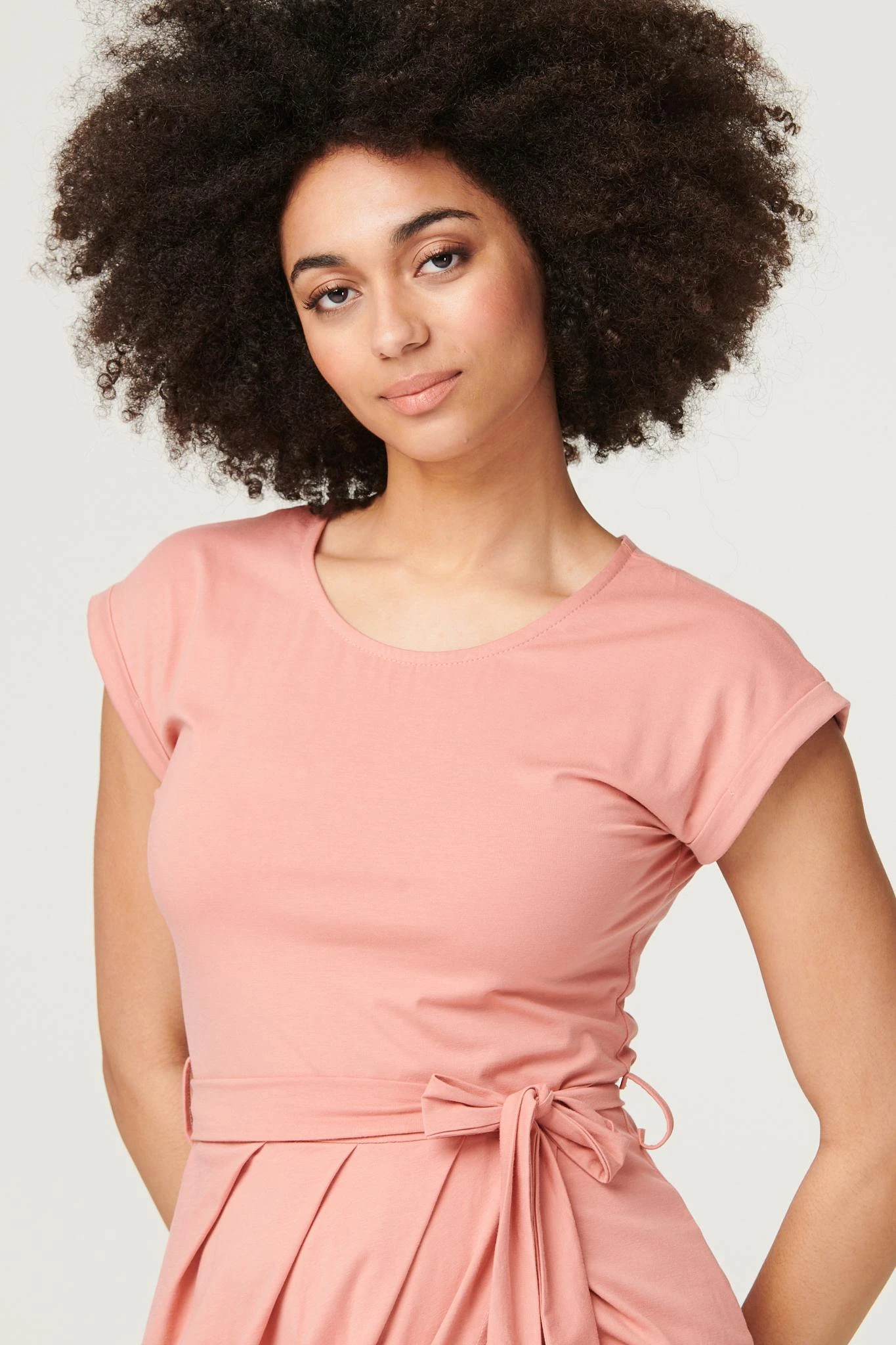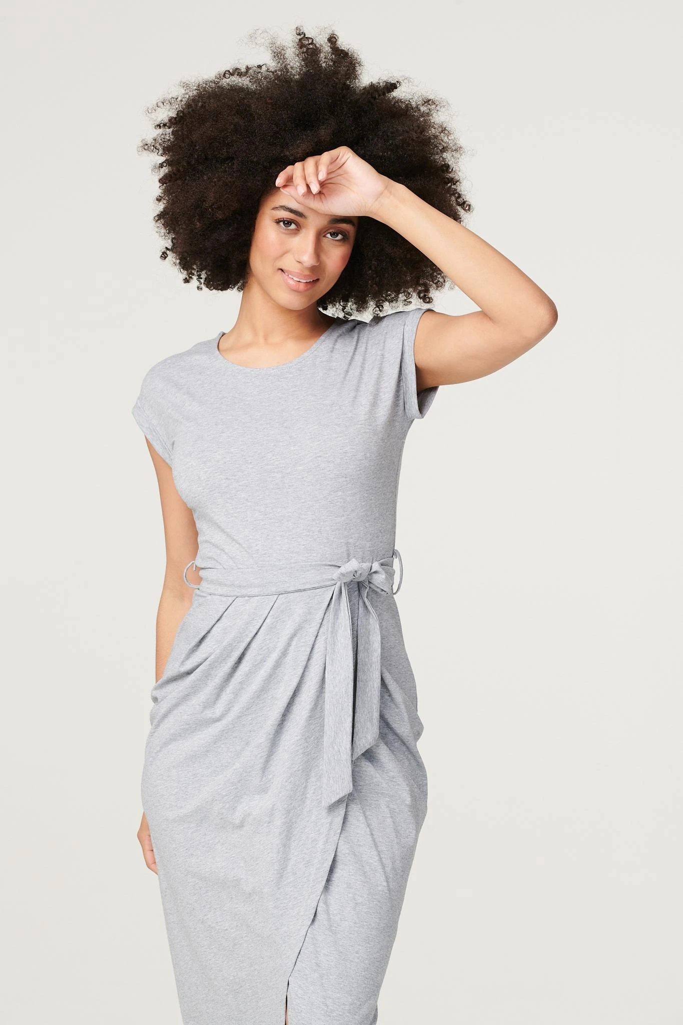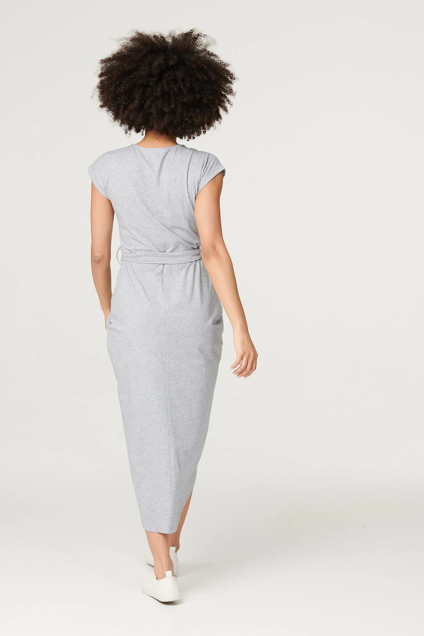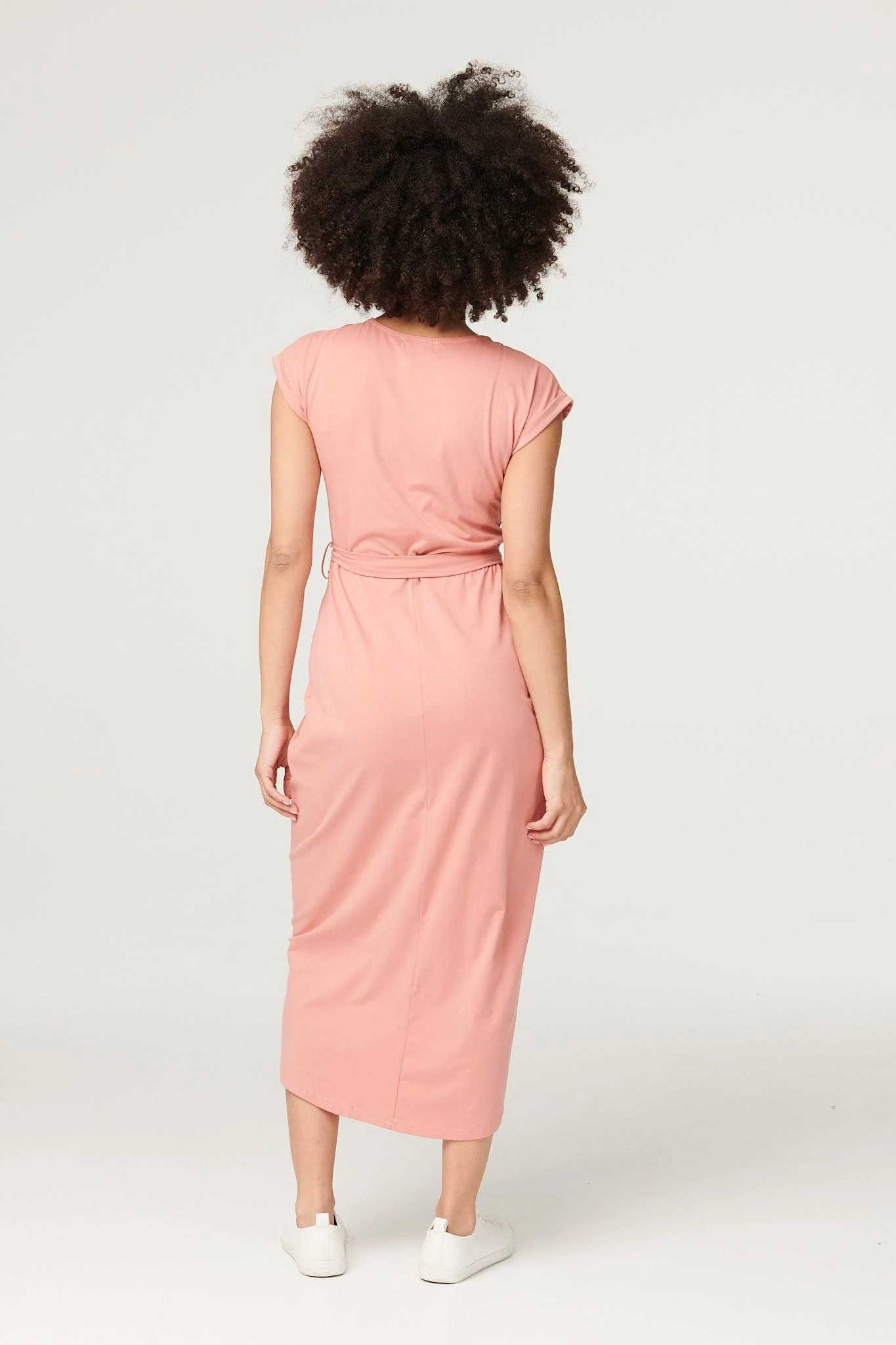 Elevate your off-duty look with this flattering yet comfortable tulip dress. Made from a soft stretch jersey fabric, it has a round neck, short turn-up sleeves, a removeable self-tie belt and a tulip shape midi length skirt. Team with fresh white trainers and layer with a cropped denim jacket for an on trend weekend style.