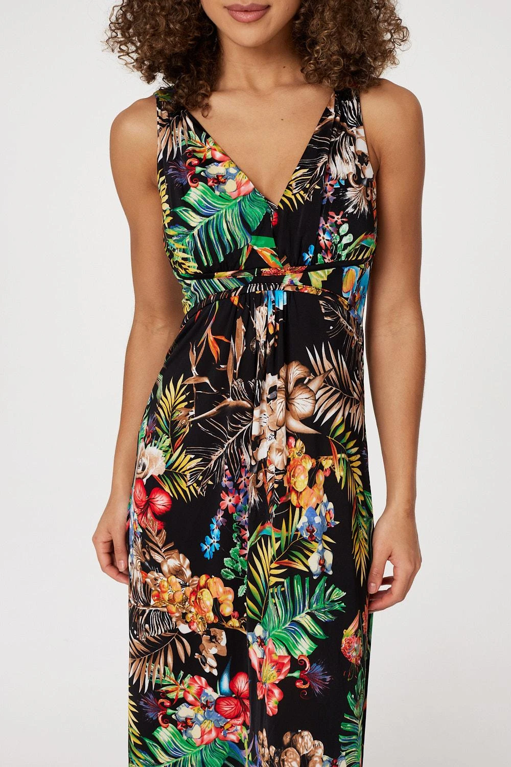 Add a vibrant tropical print to your holiday wardrobe with this sleek maxi dress. No need to iron and made from a soft stretch jersey fabric, it has a deep v-neck, wide cami straps, an a-line maxi length skirt and an empire silhouette. Pair with sandals for lunch by the pool or elevate with heeled espadrilles for alfresco evening drinks.
