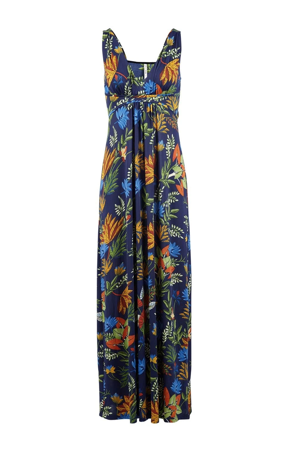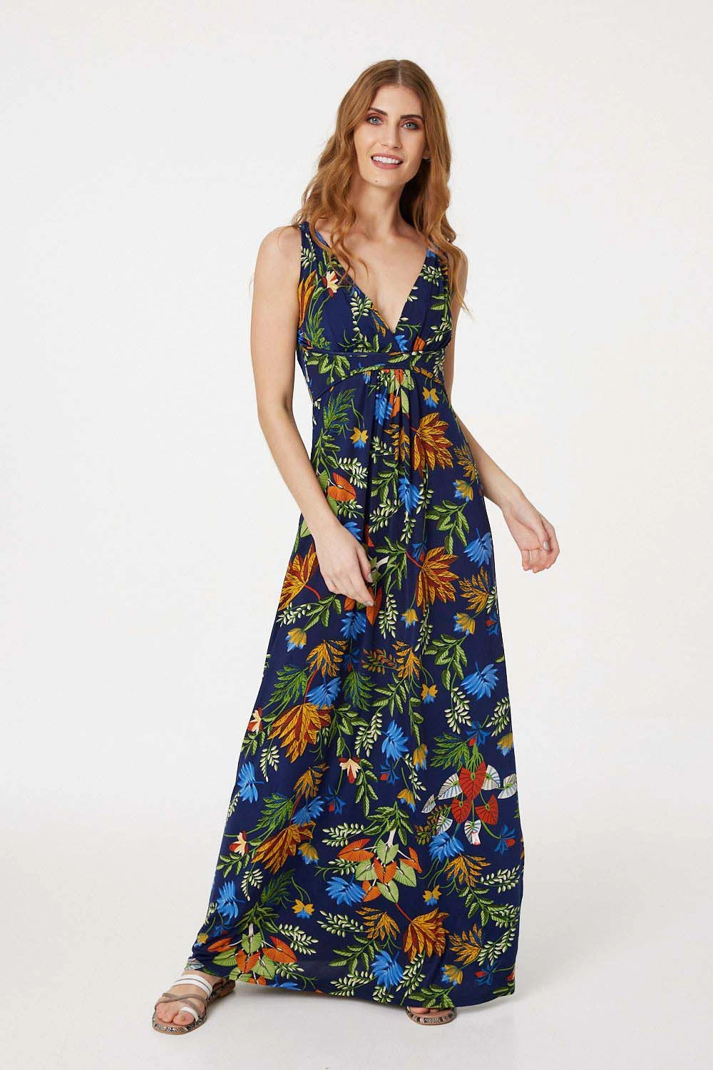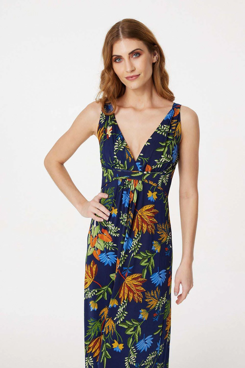 Get holiday ready with this vibrant tropical print maxi dress. It has a plunge v-neck, thick cami straps and a empire waist detail and a flattering fabric. Wear with sandals and a light denim jacket.