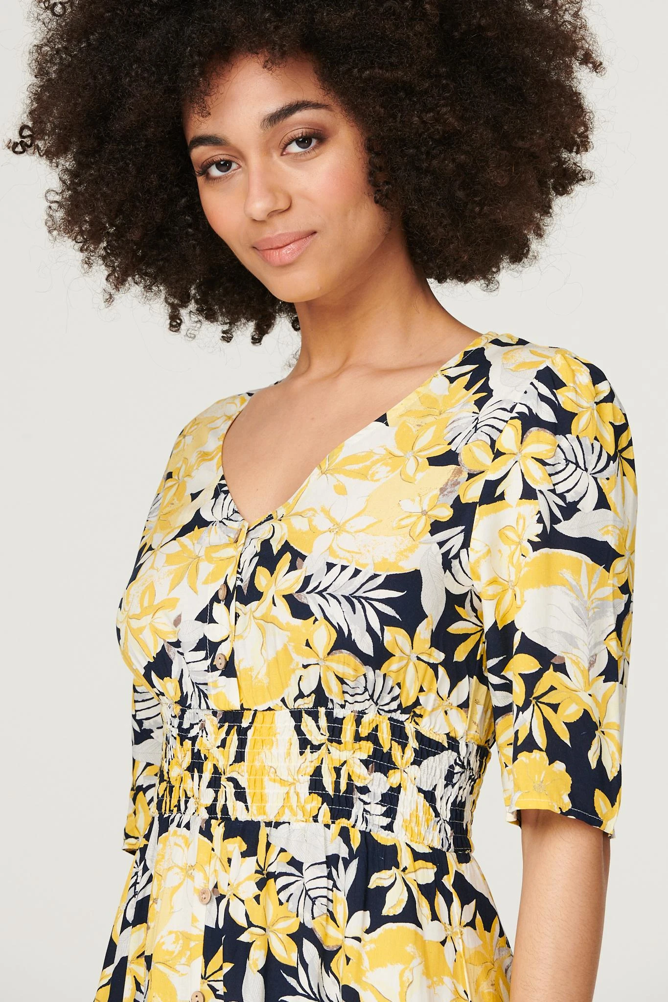 Add a statement style to your dress collection with this tropical print maxi dress. It has a v-neck, button front, 1/2 sleeves, a shirred waist and an a-line midi skirt with a front split. Pair with neutral strappy heels or for a look that’s perfect for lunch out with friends.
