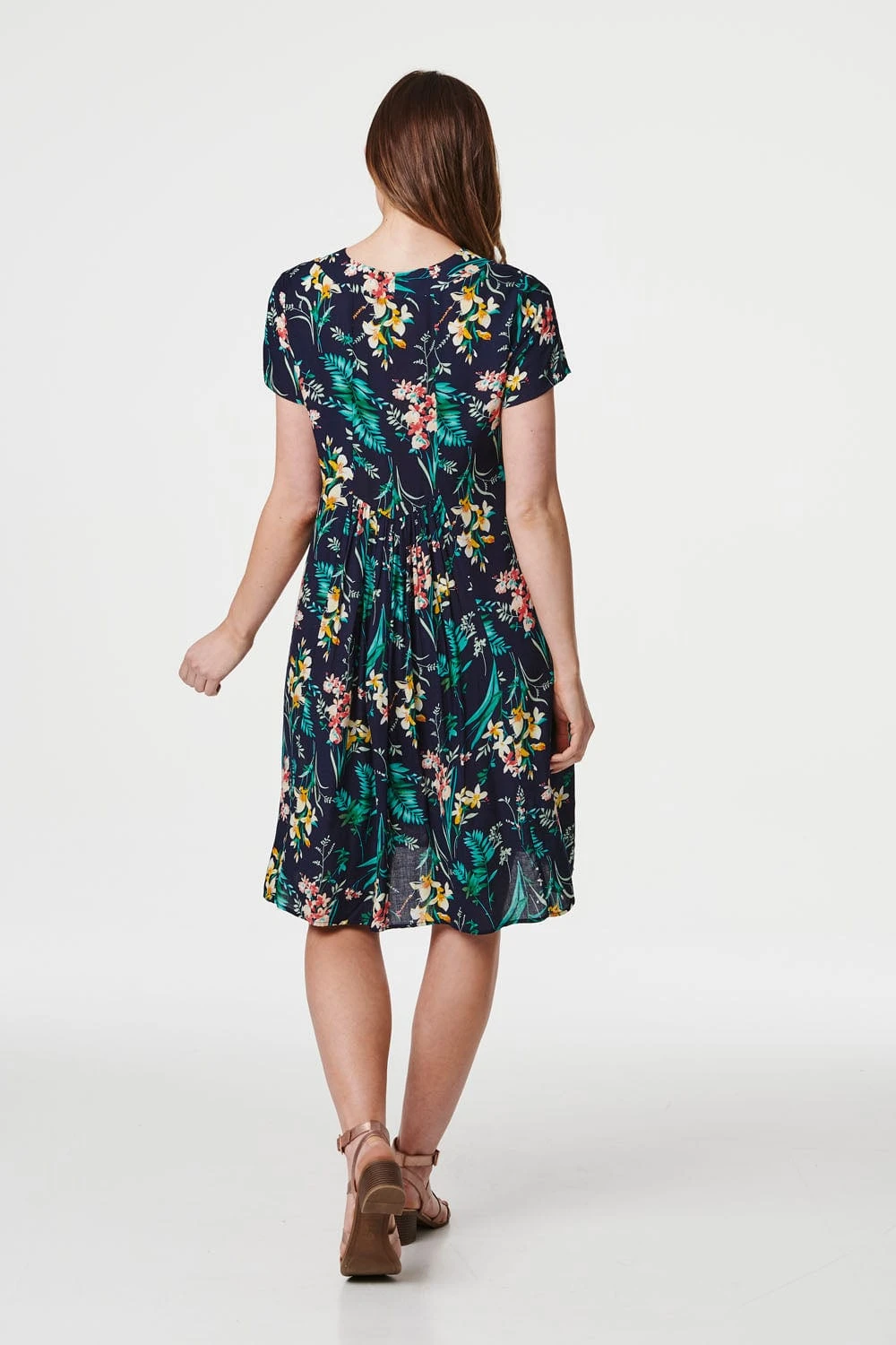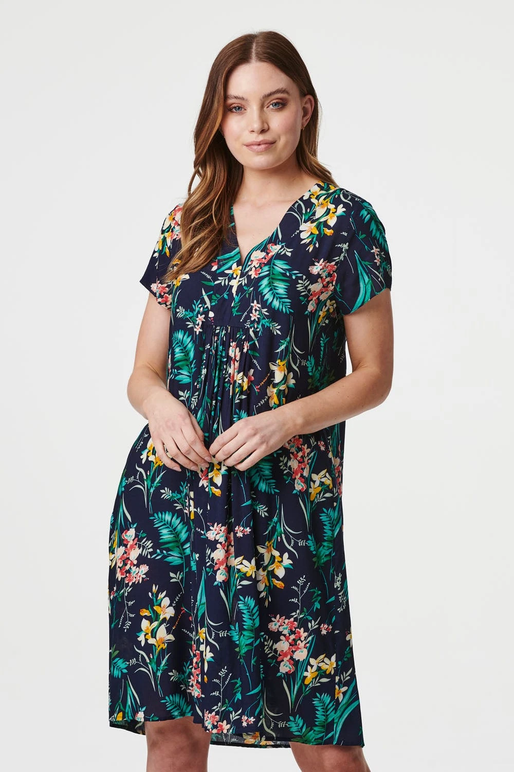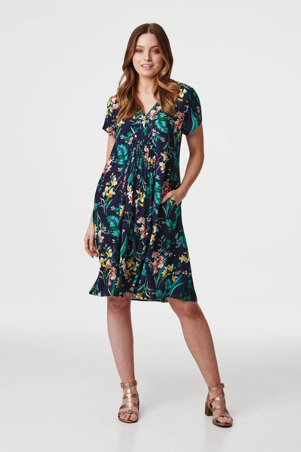 Add a bold tropical print shift dress to your closet with this relaxed look. With a v-neck, short sleeves, pockets and knee length skirt. Style with flat gladiator sandals for the ultimate in comfortable warm weather dressing.
