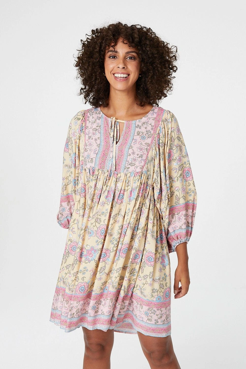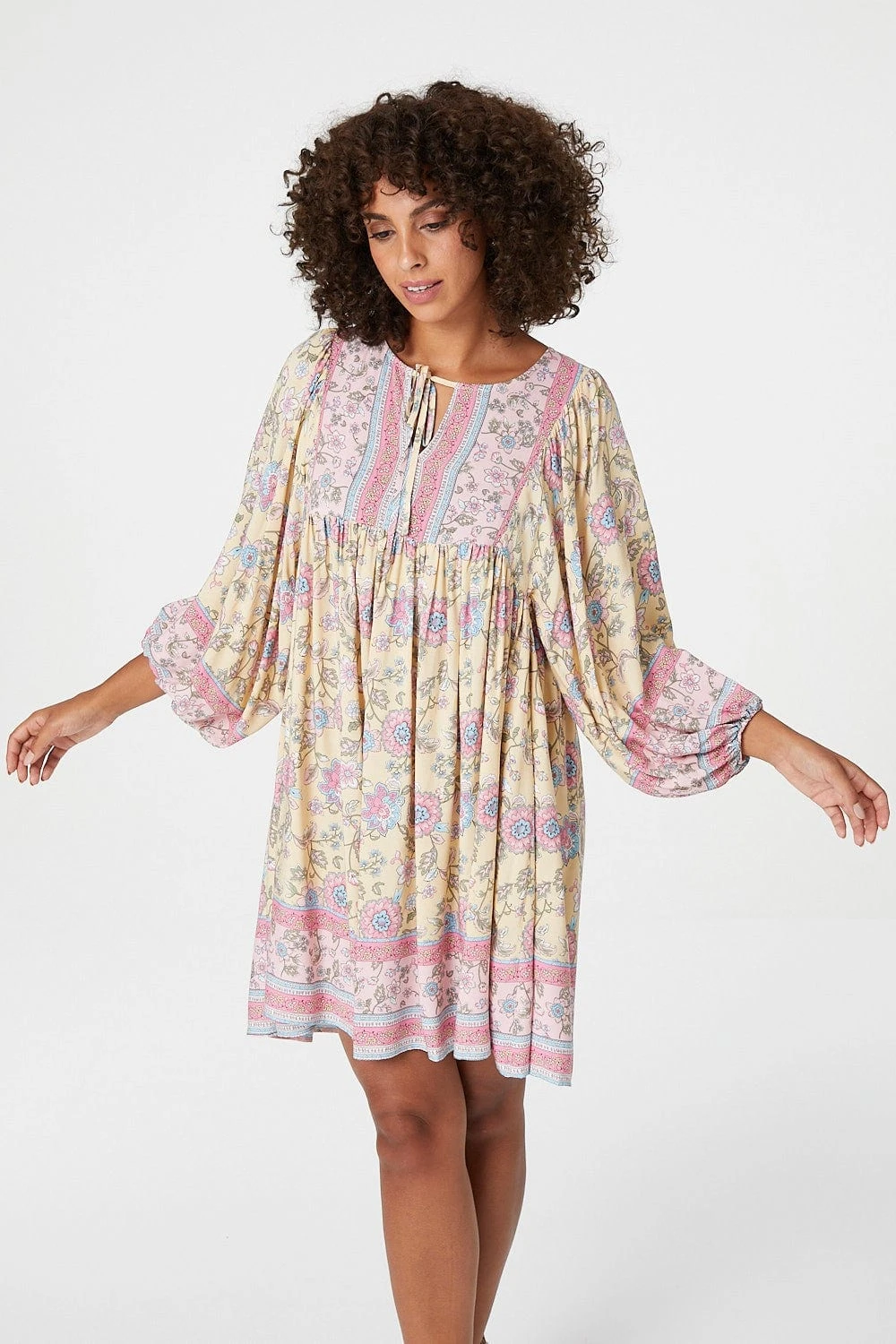 Add an on trend vintage floral smock dress to your closet. With a round neck, 3/4 sleeves and a classic smock skirt sitting above the knee. Pair with leggings and sandals for a cool yet comfortable daytime outfit.