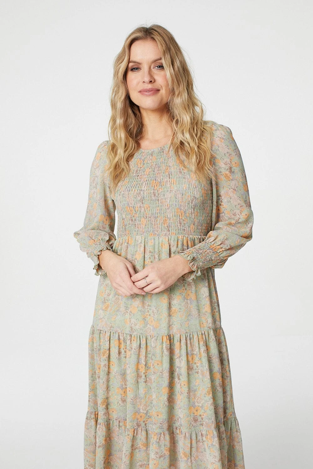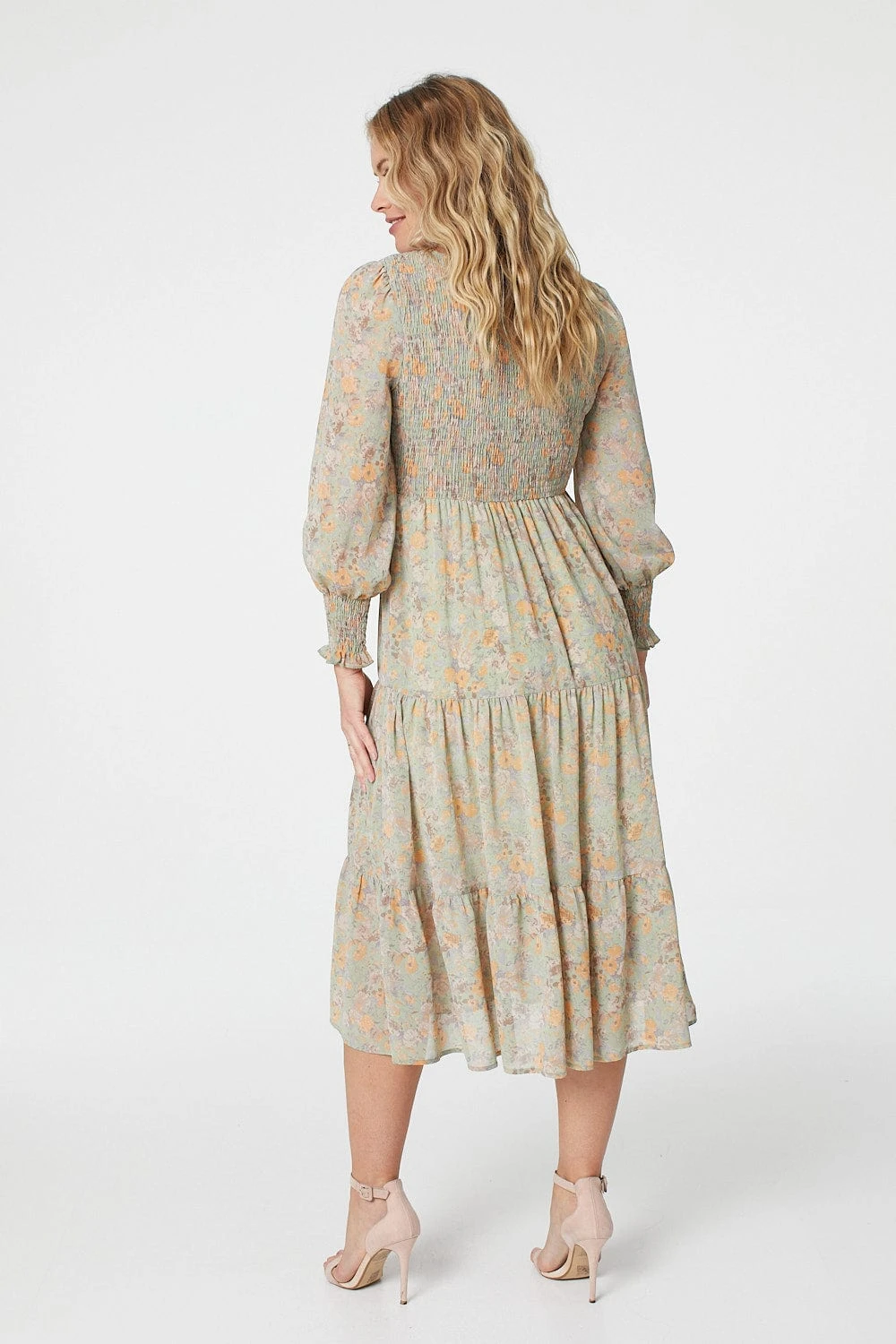 Add a comfortable vintage floral midi dress to you collection. With a round neck, long sleeves, a shirred bodice and a tiered midi skirt. Pair with espadrille wedges for a chic daytime look for any occasion.