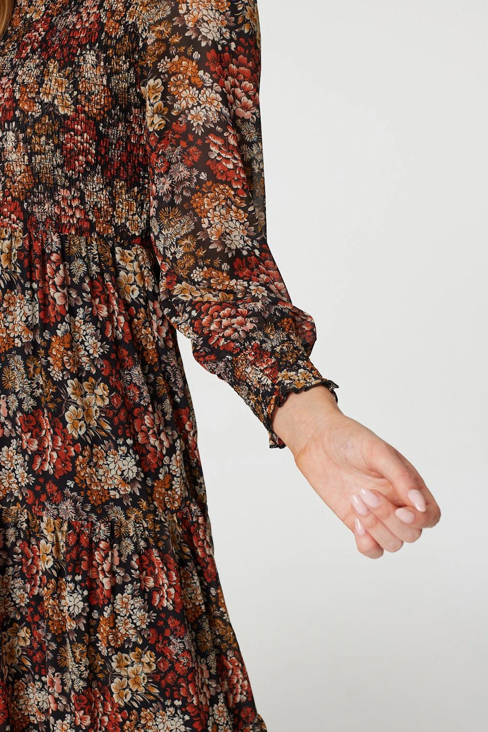 Make a statement in this vintage floral midi dress. With a round neck, a smocked bodice, long semi sheer sleeves and a tiered midi length skirt. Style with heeled wedges for the weekend or dress up with pointed close toe heels for a versatile look.
