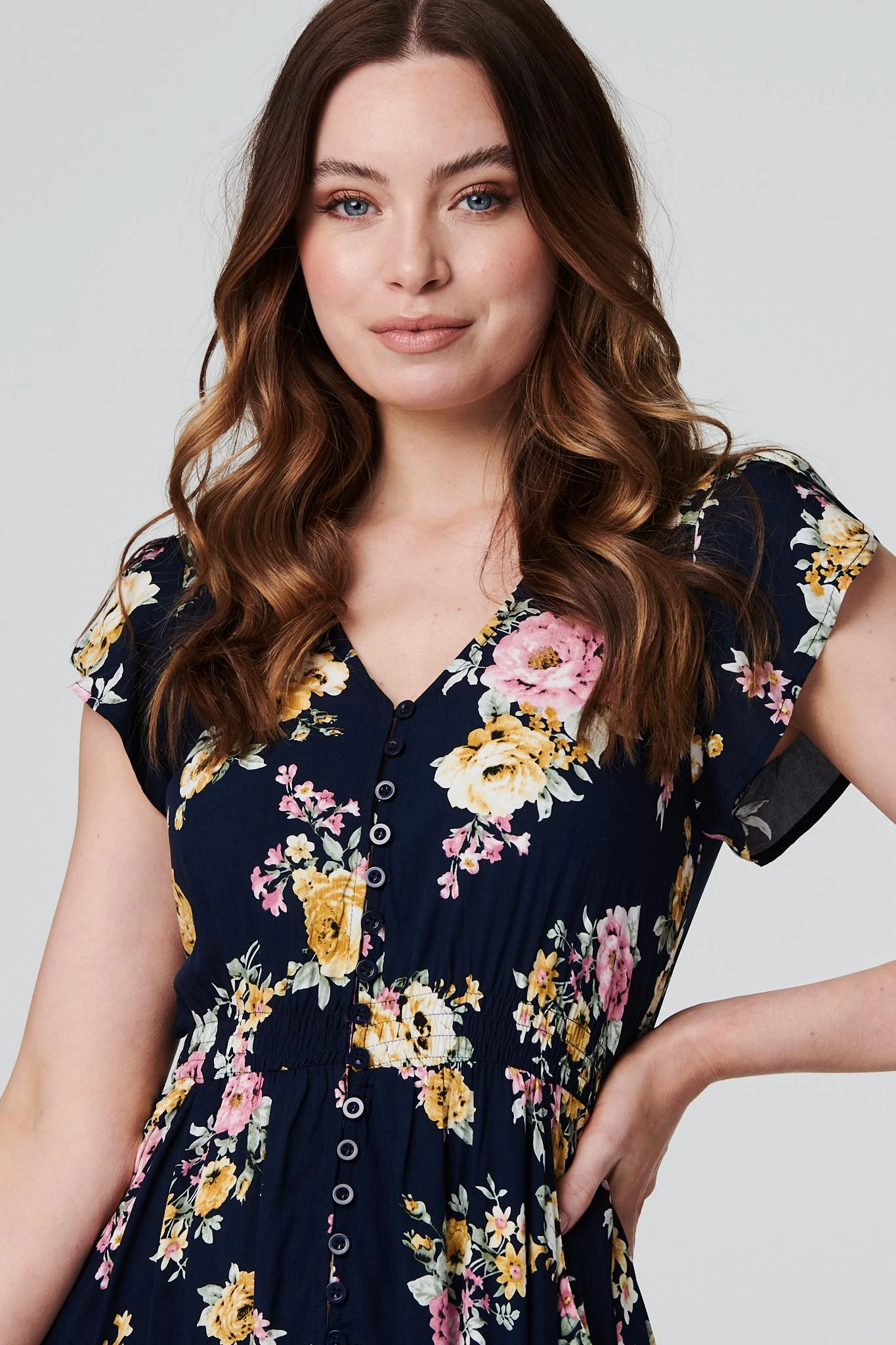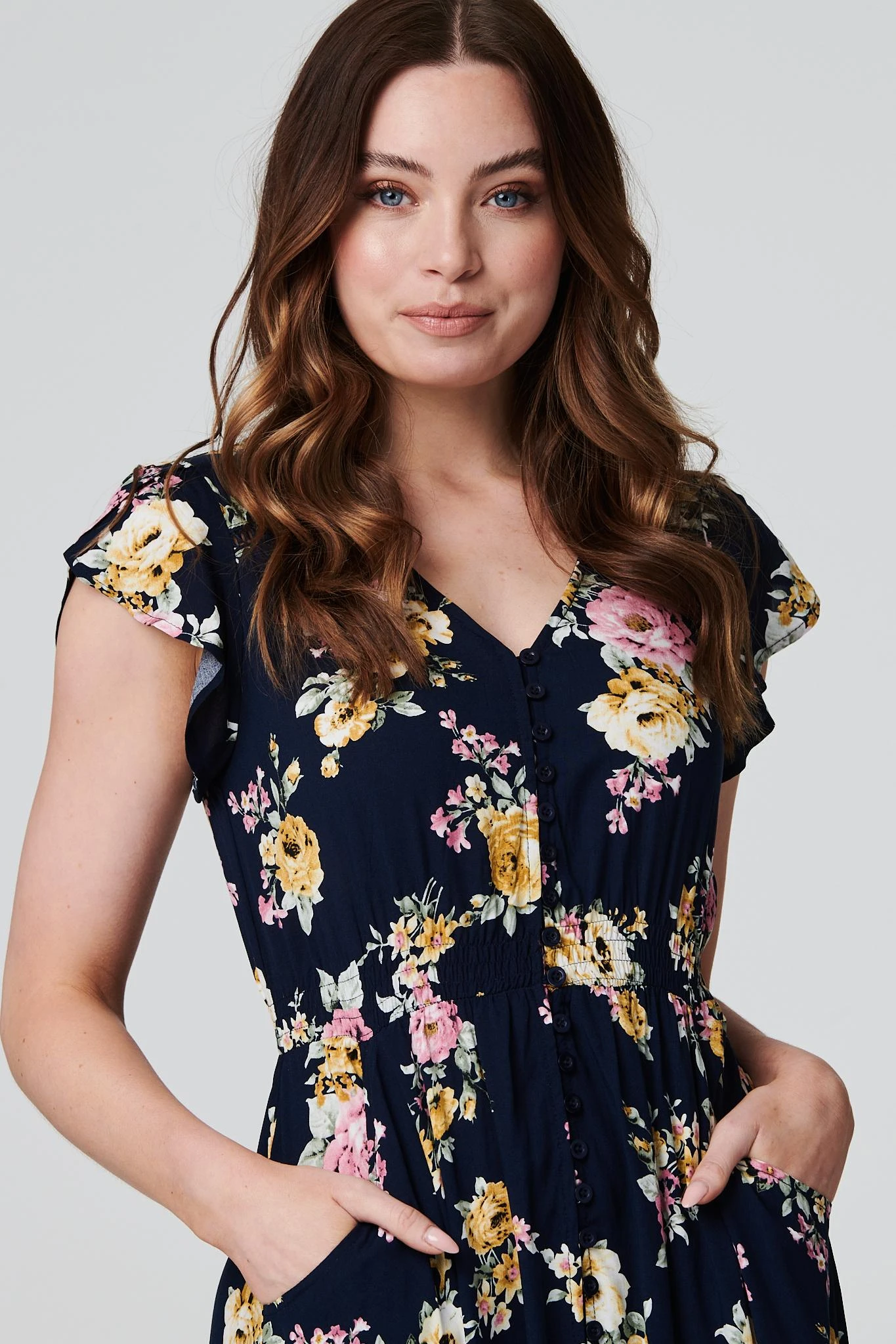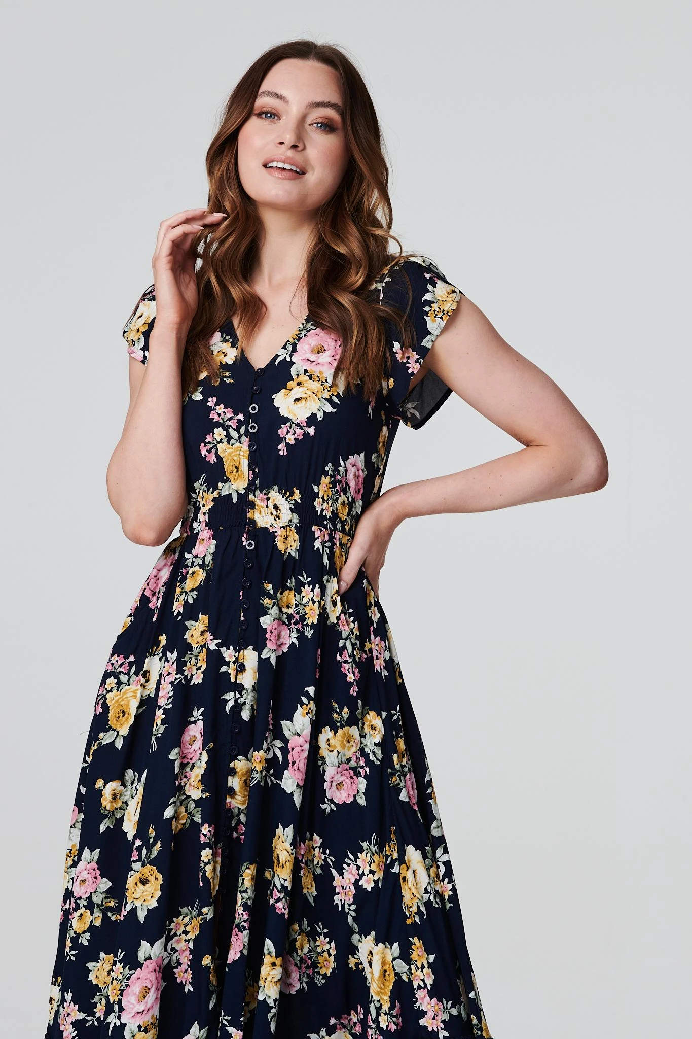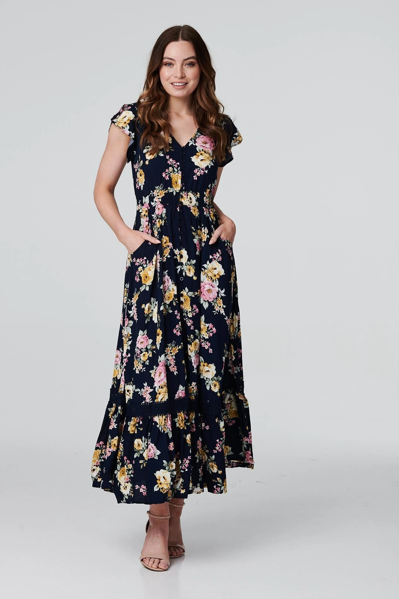 Add a vintage floral print to your dress collection with this elegant maxi dress. It has a v-neck, short cap sleeves, button front detail, shirred waist, pockets and a maxi length skirt with a lace trim. Made from 100% breathable viscose, it’s a versatile and lightweight addition to your holiday closet. Pair with neutral heels or wedges for an on trend warm weather style.