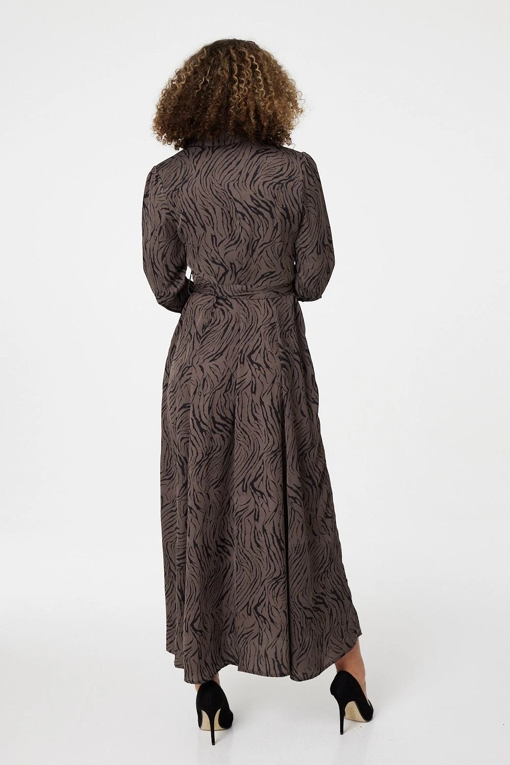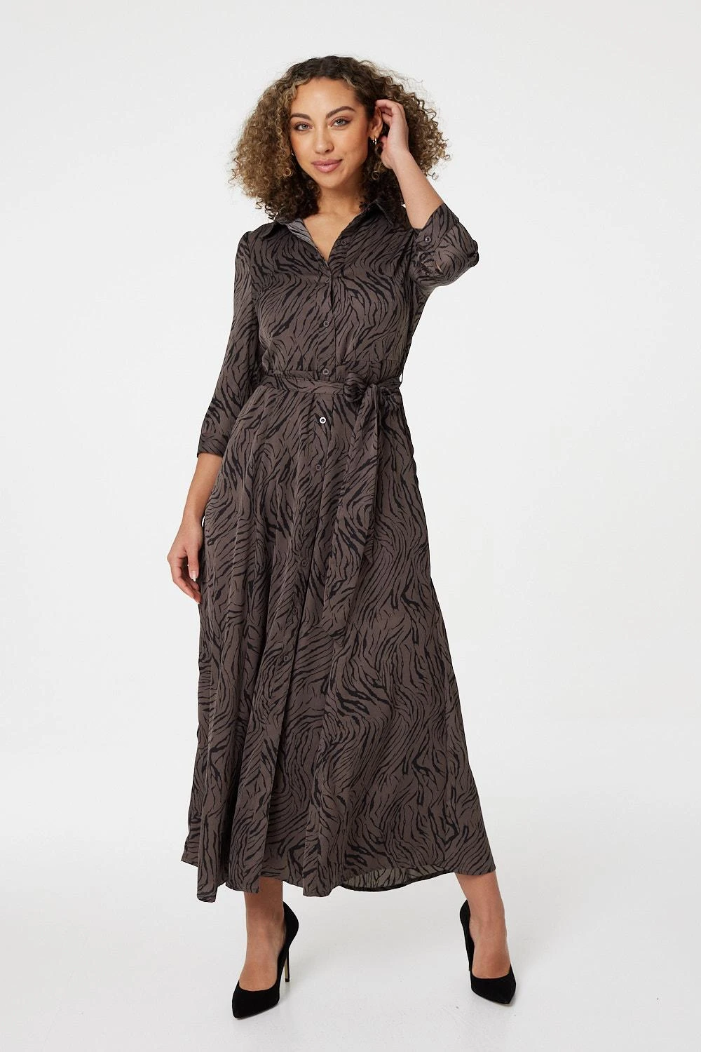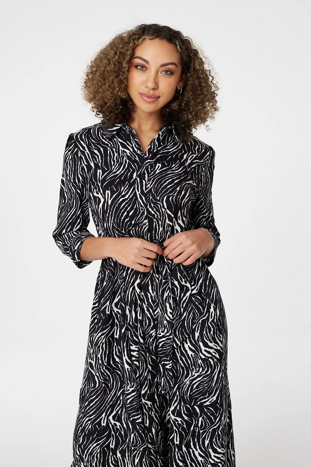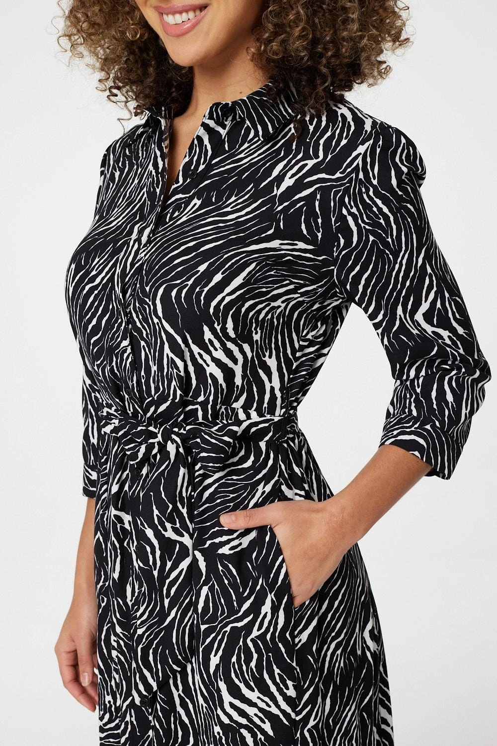 Every dress collection needs a flattering shirt dress like this zebra print midi style. With a round neck, a classic collar, a button front, a self-tie belt, 3/4 sleeves, pockets and a classic a-line midi skirt. Style with knee high boots for an effortless weekday to weekend outfit.