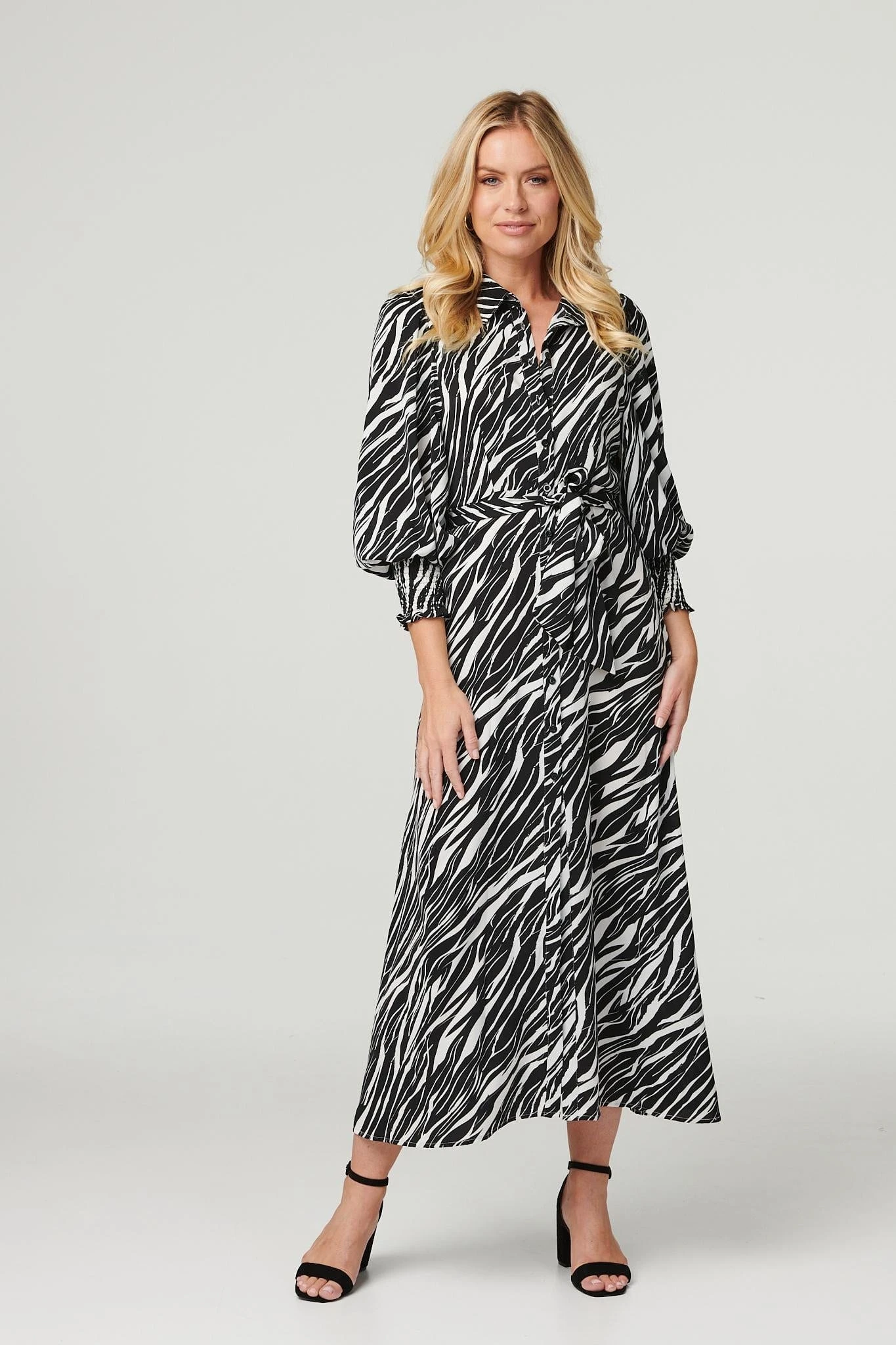 Turn heads in this standout zebra print shirt dress. It has a collar, button front, 3/4 puff sleeves with shirred cuffs, a self-tie waist, a-line silhouette and a midi length skirt. Pair with strappy heels for a sophisticated style you can wear for drinks with friends, or a day at the office if you’re bold enough!